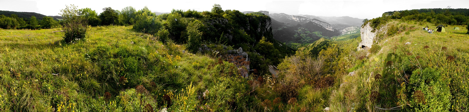 Alles deutet auf einen Klettertrip hin, der vielseitiger nicht werden kann. Hier fällt es gar nicht so leicht die Kletterausrüstung zu packen – neben Friends und Klemmkeilen dürfen die Kletterhelme und eine ordentliche Vorratspackung Magnesium nicht fehlen – es könnte heiß werden! Die Kletterschuhe wählen wir bequem, falls wir uns vermehrt für die sonnigen Mehrseillängen entscheiden! Wir fahren vollbepackt voller Erwartung vom verregneten Allgäu los. Die Flucht vor Regen und Nebel geling! Nach 8 Stunden Fahrt kommen wir an: uns bietet sich ein imposantes Panorama! Gigantische Felsriegel stehen hier in in einer Landschaft, die ihresgleichen sucht. Wir machen uns auf die Suche nach einem Campingplatz, aber nach einer so anstrengenden Fahrt wollen wir nur noch schlafen. Der Campingplatz muss morgen gefunden werden. Erschöpft fahren wir nach Presles, was sich auf einer Anhöhe als ein kleines typisch französisches Dorf präsentiert. Eine große vor Wildblumen strotzende Wiese oberhalb des Sportklettersektor Tina Dalle im Les Rochers de Nugues muss für die erste Nacht herhalten. Camping auf so einer Wiese mit solch einem Ausblick hat Seltenheitswert und wir freuen uns schon auf das erste Panoramafrühstück.