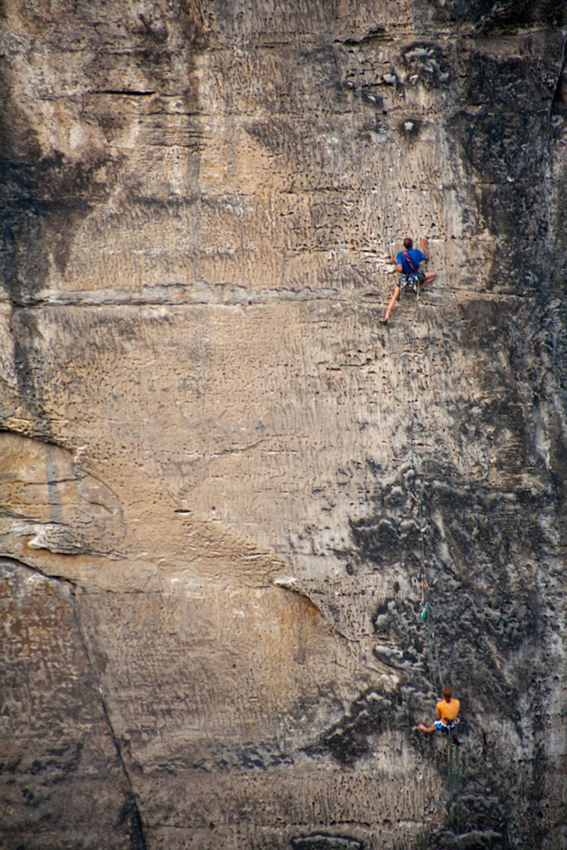 An den Sandsteinfelsen darf nur geklettert werden, wenn diese trocken sind. Der Felsen ist einfach nicht so fest, wenn er nass ist. Also muss nach dem Regen mindestens ein Tag gewartet werden, bis die Felsen wieder trocken sind. Andernfalls droht Felsbeschädigung und Absturz durch Griffausbruch.