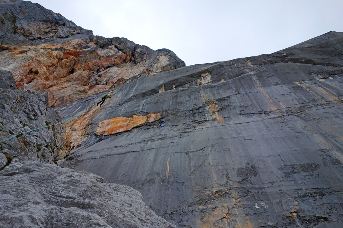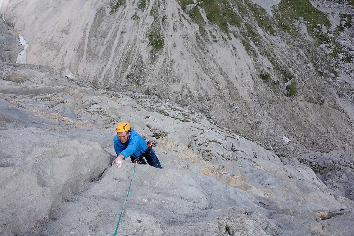 Zum Teil seilt man direkt über die Routen ab. Meistens kommt man aber am Grat raus und klettert diesen herunter. Hier ist nochmal der komplette Alpinist gefragt. Der Fels ist nicht immer fest und das Gelände ist recht ausgesetzt. Auch die Wegfindung ist am Ende nicht ganz einfach. Wir seilen, nachdem wir den Grat ein Stück runtergeklettert sind, immer über die „Knapp-Köchler“ ab. Das ist sehr bequem, empfiehlt sich aber nur, wenn diese bereits bekannt ist. Ein 60 m Seil ist dabei vorteilhaft.