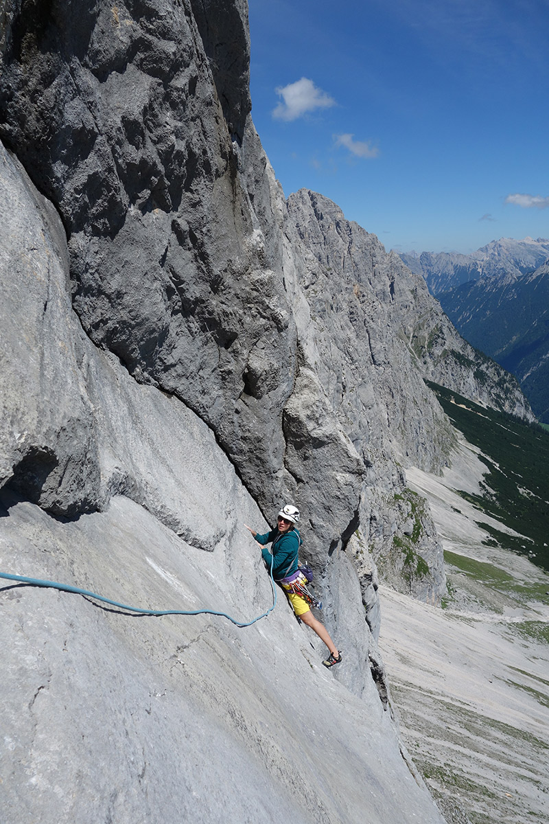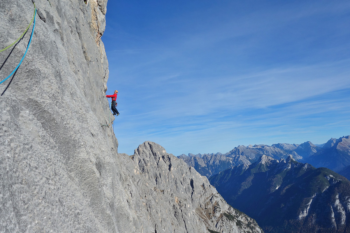 Doch es gibt noch einige andere tolle Routen in allen Schwierigkeitsgraden und verschiedenen Stilen. Auf bis zu 400 Metern Wandhöhe und 12 Seillängen ist in perfektem Wettersteinkalk alles geboten, was das Alpinkletterherz begehrt. Glatte Platten, löchrige Überhänge und raue Risse. Und wenn gewünscht, auch mal ein ordentlicher Runout.