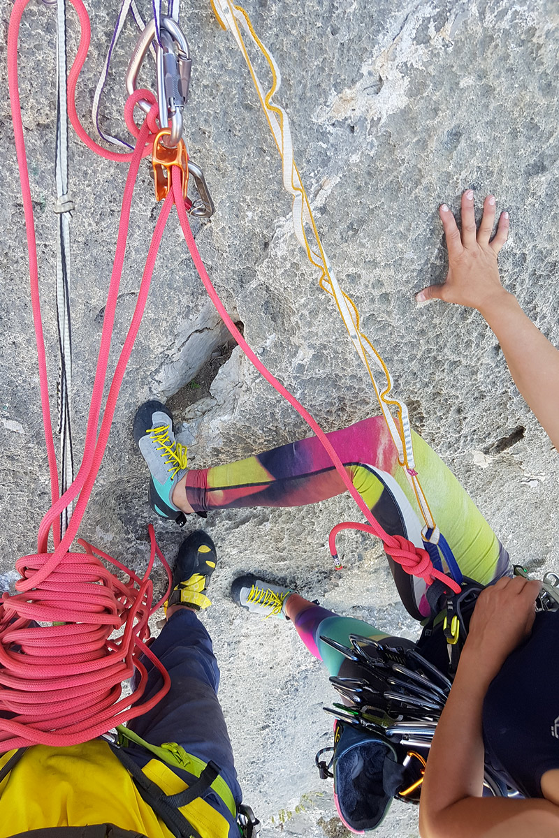 Am nächsten Tag brechen wir etwas früher auf zu einer Mehrseiltour im Sektor School – einer abwechslungsreichen Plaisirroute mit Blick auf Telendos, der kleinen Schwester von Kalymnos. Auch hier macht sich der Millet Rock Up recht gut. Nach stundenlangem Klettern bei heißen Temperaturen habe ich keine schmerzenden Füße und ich bekomme trotzdem die Performance, die nötig ist.