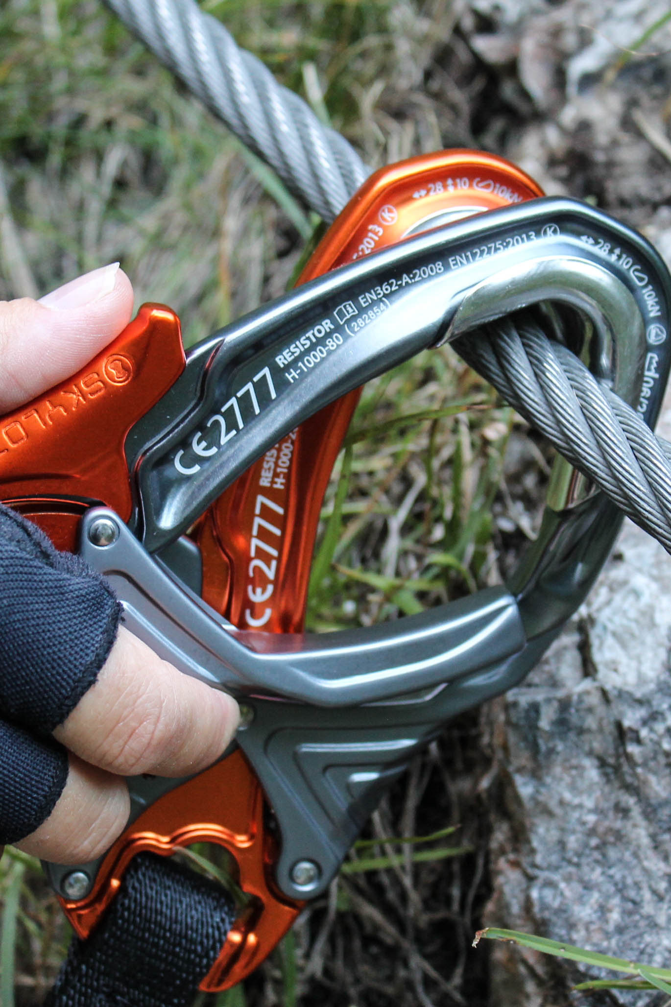 „Das Set besteht aus zwei robusten und leichtgängigen Karabinern, die für ein schnelles und benutzerfreundliches Umhaken sorgen. Eine hohe Sicherheitsreserve schenkt dem Benutzer das nötige Vertrauen. Resistor Karabiner mit Stahlinlet im Scheitel bieten maximalen Abriebschutz und verfügen über eine leichtgängige Handballensicherung. Der integrierte Bandfalldämpfer löst auch bei 180 Grad-Fehlanwendung aus und ist somit kurzschlusssicher.“ Okay, soweit das Versprechen von Skylotec.