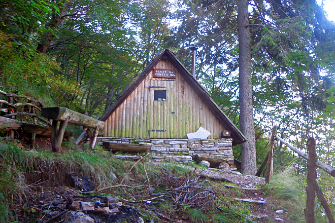 Nach einiger Zeit gabelt sich der Weg und wir halten uns Richtung „Bivak“. Denn vorbei am „Bivak na Crniku“ verläuft die Route hinein in die Westwand. Wer dem Schild „Krn“ folgt, der trifft auf den Wanderweg von der „Planina Kuhinja“ – einer Alm oberhalb des Dorfes Krn auf rund 1.000 Metern gelegen. Dieser Wanderweg ist sozusagen der „Normalweg“, den die meisten Bergwanderer wählen. Wobei „die meisten“ hier relativ sein dürfte. Denn viel begangen sind die Berge im Soca-Tal zum Glück nicht – und schon gar nicht im Herbst. Wir sehen in den nächsten Stunden keine Menschenseele. Am Gipfel erst treffen wir auf einen Wanderer, der von Krn hinaufgekommen ist – ein Wanderer in insgesamt gut neun Stunden, das ist zu „ertragen“.