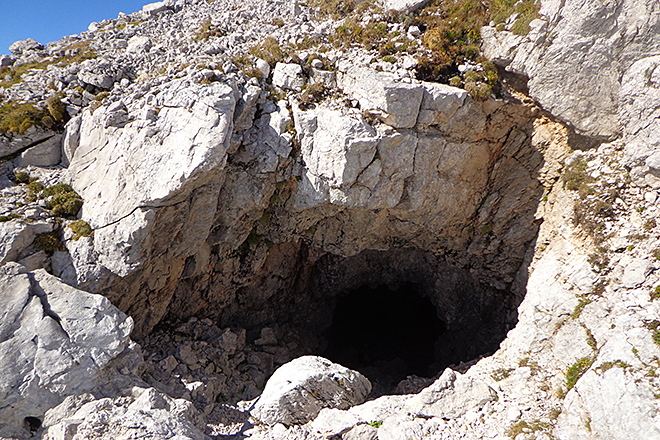 Nach einer ausgiebigen Brotzeit machen wir uns an den Abstieg. Wir wählen die „Normalroute“ Richtung Planina Kuhinja und schrauben uns in unzähligen Serpentinen bergab, bis wir Richtung Drežnica abzweigen und wieder in die Wolken und den Nebel eintauchen. Wir fühlen uns wie in Tolkiens Mittelerde, als wir den Crznik, den Bergrücken, der dem Krn vorgelagert ist, nun auf der andere Seite umsteigen und gen Drežnica wandern. Auch hier führt uns unser Weg an zahlreichen Kavernen vorbei, die wie schwarze Augen in den Hängen aus dem Nebel auftauchen. In einige gehen wir kurz hinein – aber die Zeit drängt, denn wir wollen vor Einbruch der Dunkelheit wieder unten sein.