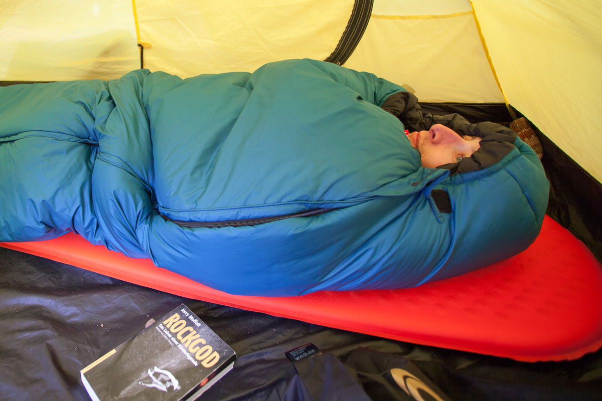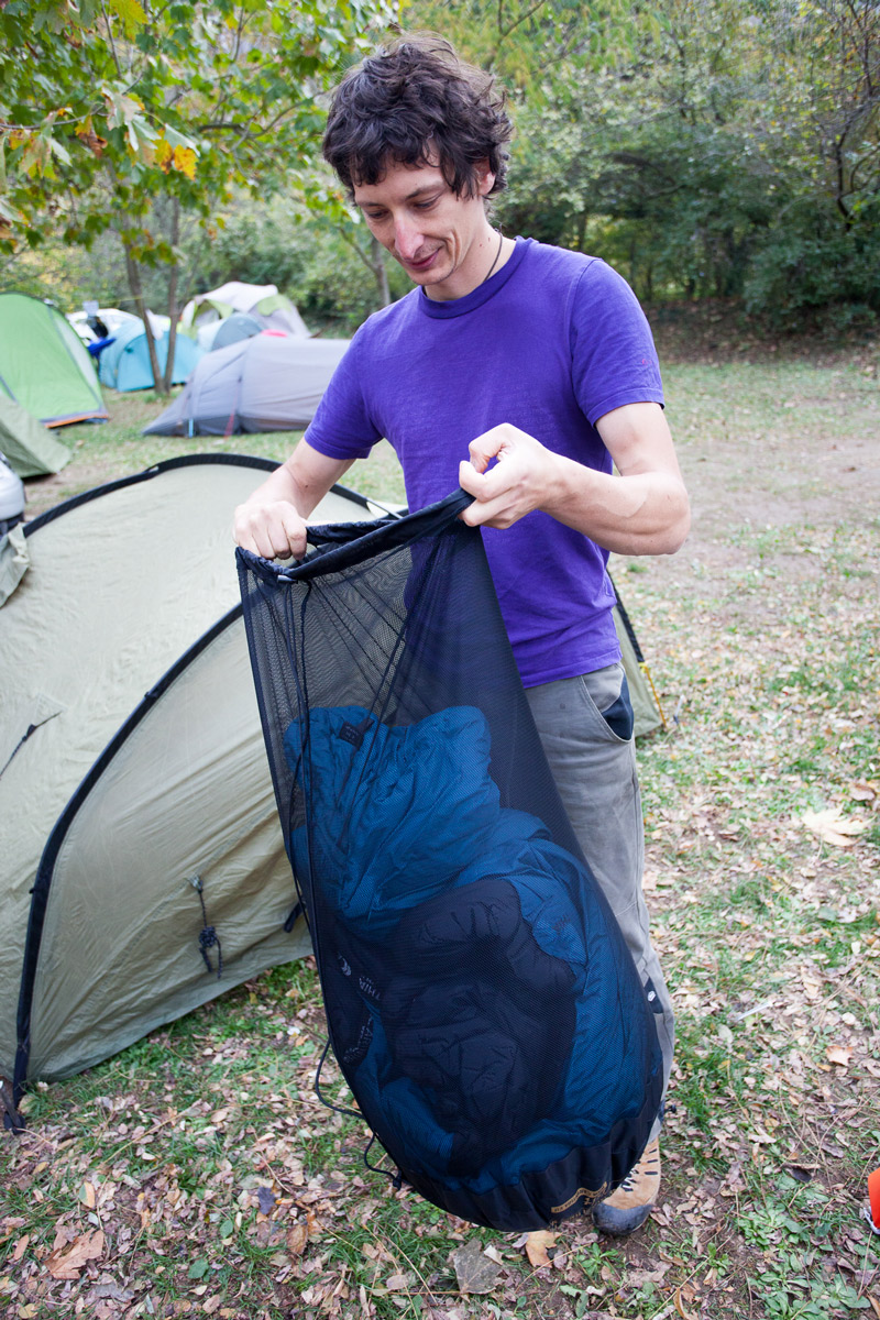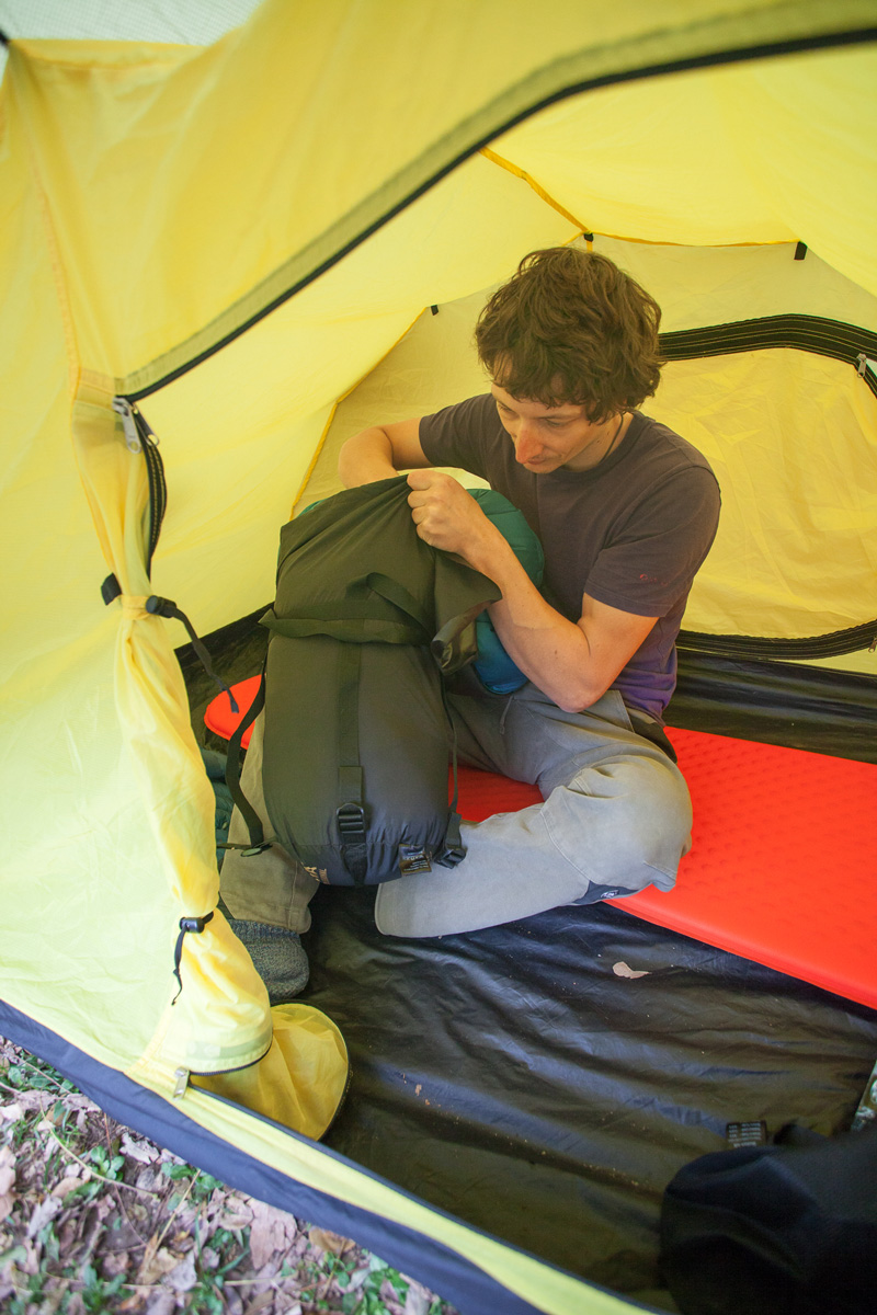 Test, zweiter Teil: Eine Nacht in den bayerischen Voralpen, hoch über dem Tegernsee. Langsam wird es Herbst und etwas kühler. Gemeinsam mit einem Freund mache ich mich nachmittags vom Parkplatz Hufnagelstube auf. Zugegeben: Mein Schlafsack ist sicher nicht der kleinste, aber nachdem wir nur Zeug für eine Nacht und einen Klettertag mit dabei haben, ist das auch nicht so schlimm. Dieses Mal wird es nachts um einiges kälter und ich freue mich, als ich mich in meinen Schlafsack zusammenrollen kann. Schnell wird es warm und ich verbringe eine ruhige Nacht und wache auch kurz vor dem Morgengrauen nicht auf, was mir mit meinem alten Schlafsack einige Male passiert ist. Auch der morgendliche Tau ist kein Problem. Das Shelltex-Außenmaterial spielt gut mit, wenn der Schlafsack danach gut gelüftet werden kann. Bis wir mit dem Frühstück fertig sind, ist der G280 in der Sonne längst getrocknet.