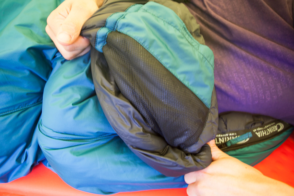 - Inletbefestigungen: Im Schlafsack sind bereits kleine Laschen angebracht, um ein Carinthia-Inlet, also eine Art Hüttenschlafsack zu befestigen. Das hat den Vorteil, dass dann nichts mehr verrutscht. Außerdem kann das Inlet einfach gewaschen werden. Den ganzen Schlafsack zu waschen ist dagegen etwas aufwendiger.