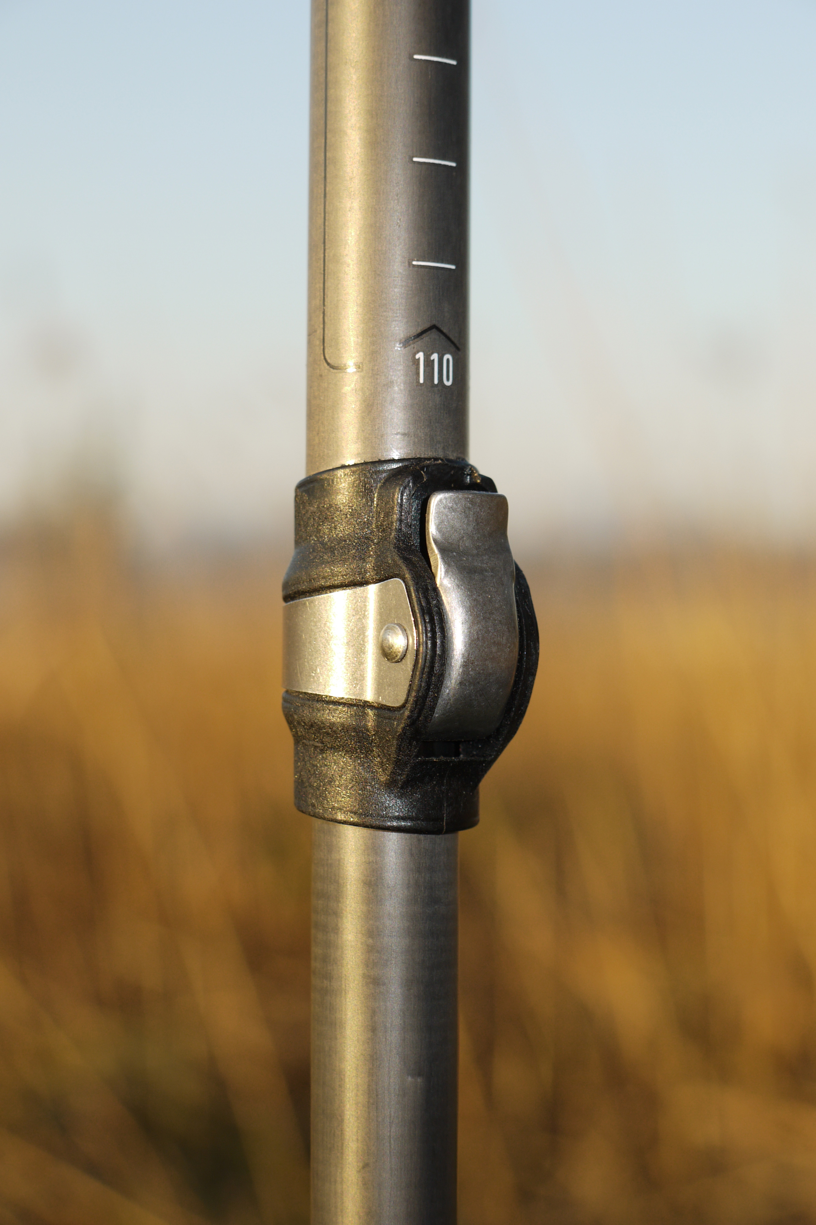 Wie schon der Name vermuten lässt, befindet sich der Verschlussmechanismus beim ELD außerhalb des Stocks. Eine Art Wippe rastet in eine Rille ein und fixiert so die Segmente. Dadurch lässt sich die Stockspannung auf Knopfdruck lösen und dann falten. Das Problem vereinzelter „Selbstlösungen“ des Spannsystems gehört mit dem neuen System der Vergangenheit an.