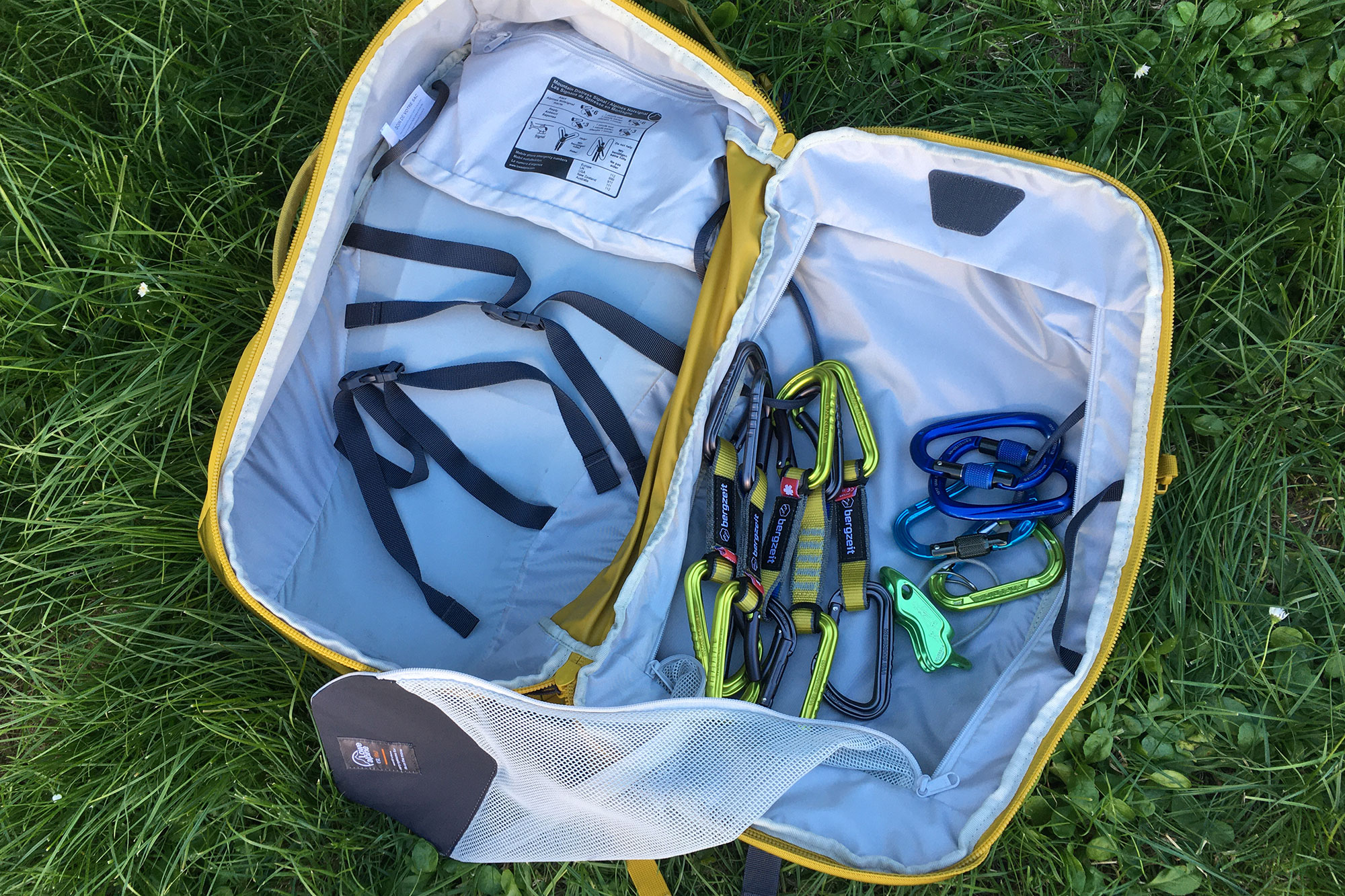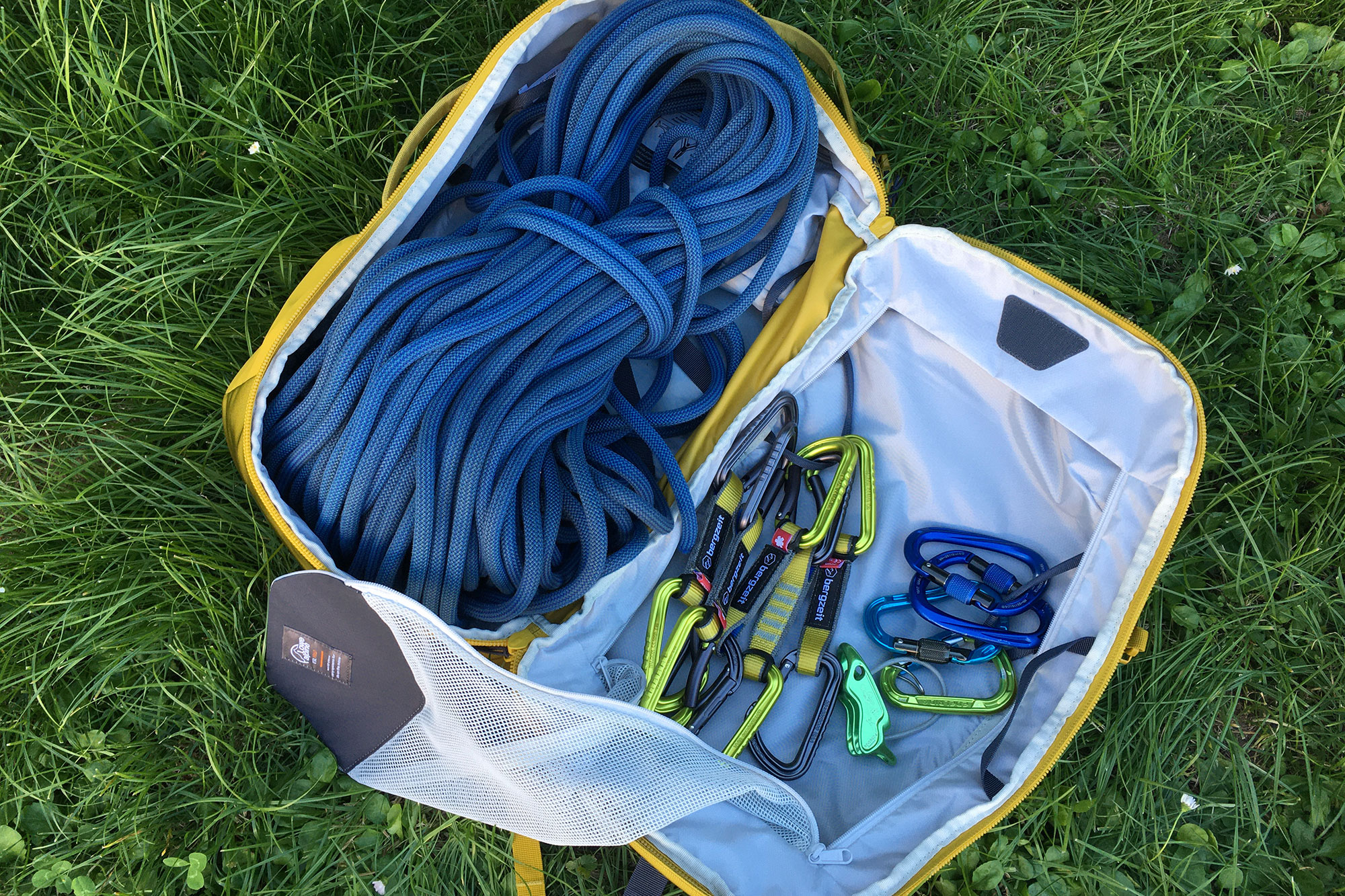 Das Innenleben des Outcasts ist wirklich super gelöst – vor allem durch die Aufklappfunktion: Man kann den Rucksack über die seitliche Öffnung wie einen Koffer aufgeklappt auf den Boden legen und hat dadurch sofort Zugriff auf sein Material, welches einfach gut sortiert und aufgeräumt ist – auch mit Hilfe der Materialschlaufen, in die man z.B. die Exen und Karabiner einhängen kann. So kann man Ordnung schaffen und durch die Netzabtrennung hat man zwei separate Bereiche. Eine Seilplane ist übrigens auch bereits dabei. Die seitlichen Tragegriffe sorgen dafür, dass man den Rucksack auch geöffnet schnell zur nächsten Route tragen kann – das fand ich sehr praktisch.