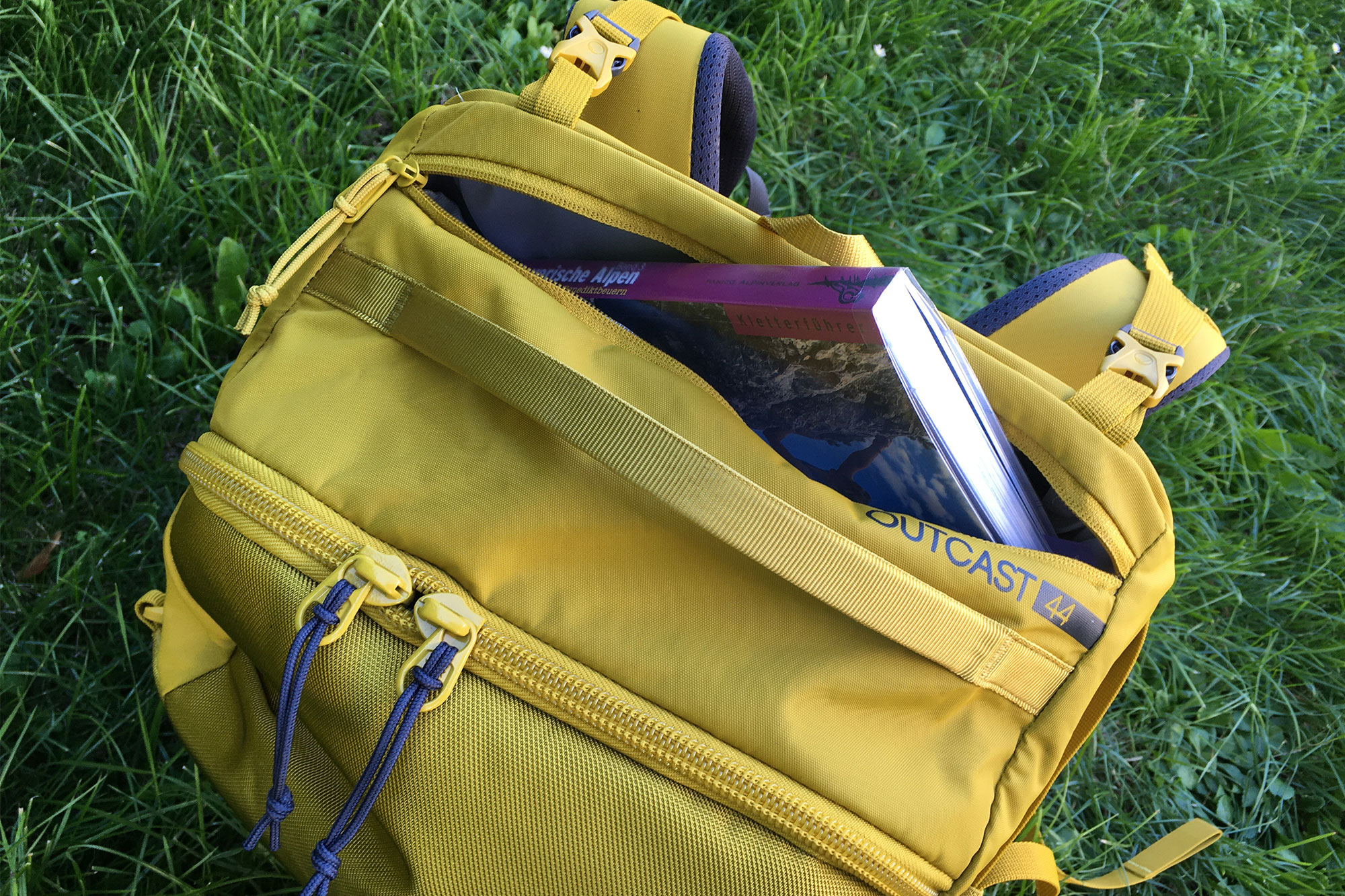 Neben dem oberen Tragegriff gibt es noch ein kleines Fach, was für den Kletterführer gedacht ist – selbstverständlich auch geeignet für Geldbeutel, Handy, Sonnenbrille und weiteres Kleinzeug.