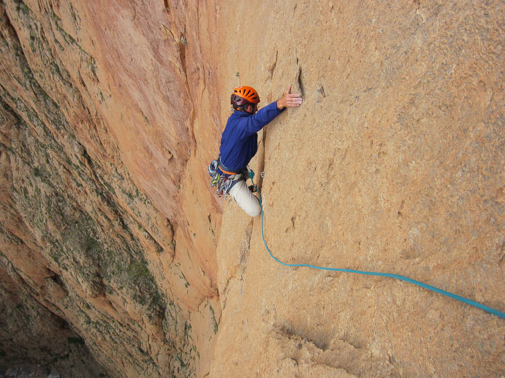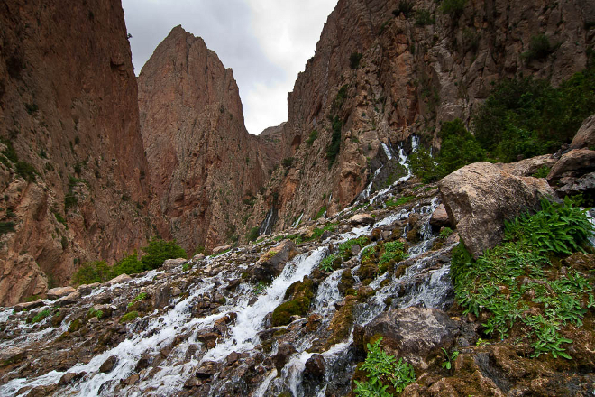 Die am einfachsten zu erreichende Wand ist Paroi des Sources, wo sich einige der leichteren Touren, sowie die geniale „Zebda“ (7b+, 250m) befinden. Läuft man weiter in die Schlucht zwischen den Wänden von Timrazine und Taoujdad hinein, steht man schon im nächsten Kletterparadies, vorausgesetzt man findet den trickreichen Weg über alle Schikanen. Häufiger geklettert wird aus der Schlucht die schöne und teils plattige „Canyon Apache“ (6c+, 355 Meter). Doch am beeindruckensten ist die Wand des Taoujdad. Hier hat sich seinerzeit sowohl der DAV-Freewall-Kader als auch der umtriebige Michel Piola ausgetobt. Letzterer hat mit „Les rivières pourpres“ (7b+, 550 Meter) eine der besten Touren erstbegangen. Dass man in Marokko auch im Regen am rauen Fels gut klettern kann, dürfen wir in den letzten Seillängen testen. So lange es trocken ist, sind die Abstiege kein größeres Problem. Bei Regen hat man die Wahl zwischen Canyoning oder Schlammrutschen, zumal alle trockenen Unterstandsmöglichkeiten bereits von zahlreichen Ziegen besetzt sind.