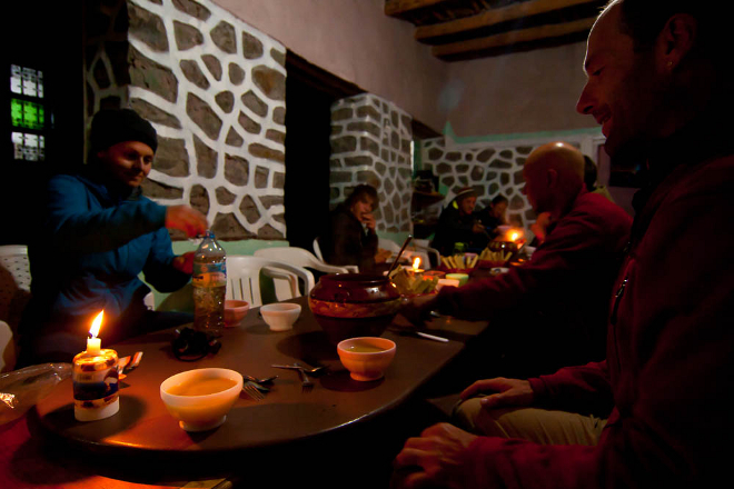 Die Scheibenwischer arbeiten auf maximaler Leistung, um uns zumindest etwas Sicht in der Dämmerung zu gewähren, wenn schon die Scheinwerfer nur diffus die Straße ausleuchten. Entweder hat M’hammed eine bessere Sicht von der Fahrerseite auf die Strecke oder er kennt sie auswendig. So feucht haben wir uns Marokko nicht vorgestellt! Aufgrund bürokratischer Schwierigkeiten wegen der Fahrzeugpapiere bei einer Polizeikontrolle in Azilal und Probleme mit dem Anlasser starteten wir deutlich später als geplant in Richtung Zaouiat Ahansal, wo wir schließlich gegen Mitternacht ankommen. Am liebsten wollen wir in unserer Gîte gleich in unsere Schlafsäcke kriechen, aber dank der marokkanischen Gastfreundschaft serviert uns der Hausherr noch um Mitternacht ein üppiges Tajine. Dankbar nehmen wir das verlockende Angbot an. Tajine ist ein typisches nordafrikanisches Gericht – im gleichnamigen Kochtopf mit kegelförmigen Deckel wird das Schmorgericht direkt aus dem Topf gegessen. Das typisch marokkanische Essen wird nicht das Letzte bleiben, doch erstmal schlafen wir todmüde in Erwartung auf fantastische Landschaften und Felsen ein.