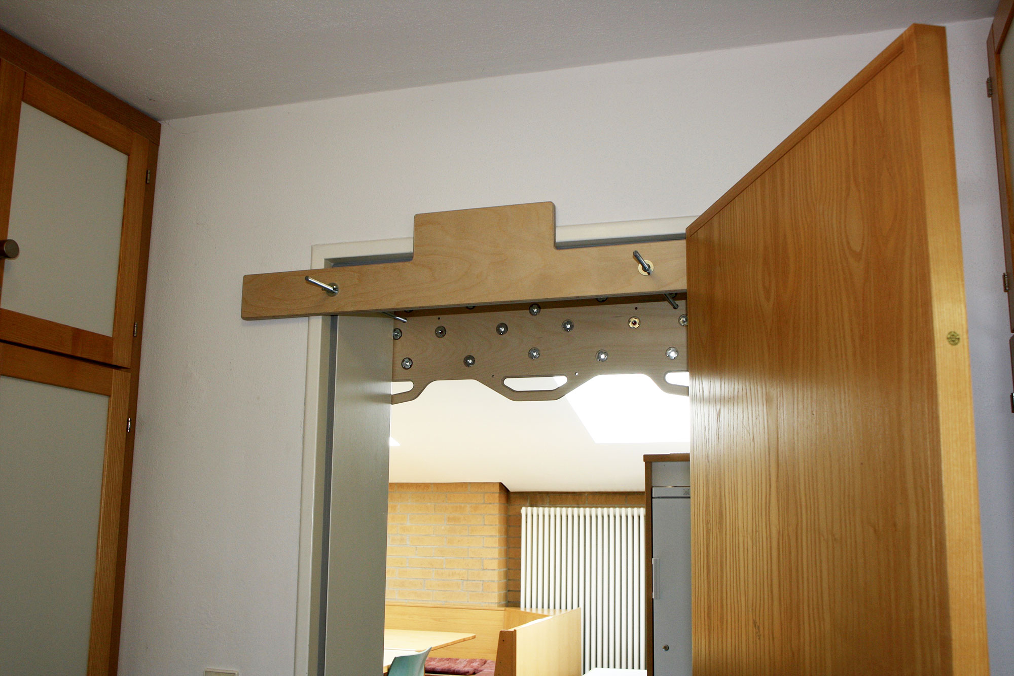 - Die angeschraubte Holzleiste, an der Oberkante des Basewood wird auf den Türrahmen aufgelegt. Dadurch muss das Board nicht mehr gehalten, sondern nur leicht an den Türrahmen gedrückt werden.