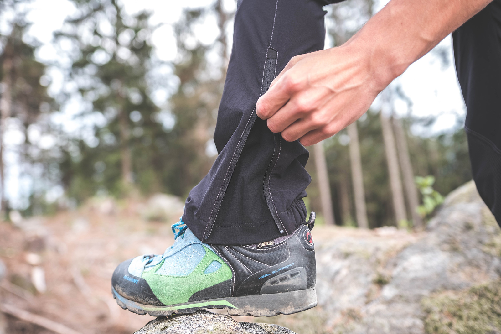 Auch der kurze, rutschfeste Gummizugeinsatz sowie der Reißverschluss am Beinende sind für mich ein großes Plus im Tragekomfort und in der Funktionalität. Der Gummizug sorgt für einen guten Halt bei alpinem Schuhwerk und verhindert somit ein lästiges Hochrutschen über den Schuh. So kann auch kein Staub oder Schnee in das Schuhinnere eindringen. Der geöffnete Reißverschluss am Beinabschluss bringt zusätzlichen Stoff zum Vorschein, wodurch die Hose individuell an verschiedene Schuhweiten angepasst werden kann.