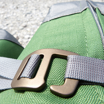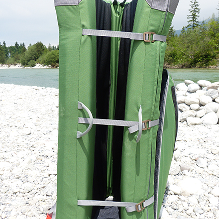 Das Tragesystem selbst ist, wie bei vielen Crashpads, einfach gehalten. Die Schulterträger sind dünn gepolstert, der Hüftgurt ohne Polster, aber breit. Die Schnallen sind zwar aus Kunststoff, wirken jedoch robust und halten gut, ohne nachzugeben. Ein kleines Manko: Die Schultergurte sind oben so eng nebeneinander angenäht, dass sie bei mir ziemlich unangenehm am Hals einschneiden. Zur Abhilfe habe ich das Gewicht vorwiegend auf den Beckengurt verlagert und so die Schultern entlastet. Das Flap, das sonst das Tragesystem schützt, wird beim Transport am unteren Ende umgeschlagen, so dass man im Inneren der Matte einiges an Material verstauen kann. Mit einem langen Klettstreifen ist der Stoff ruckzuck auf der Rückseite des Pads fixiert (am besten schräg ankletten).