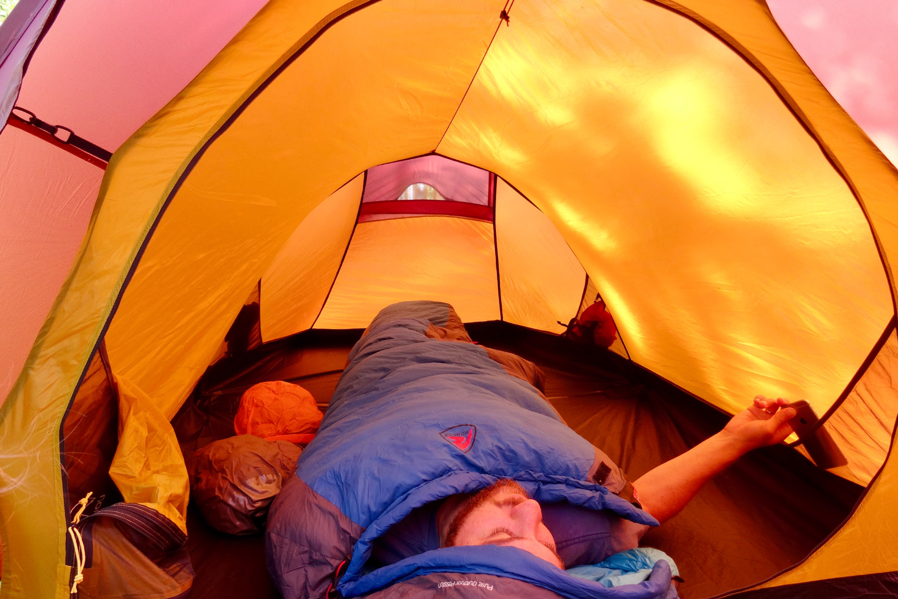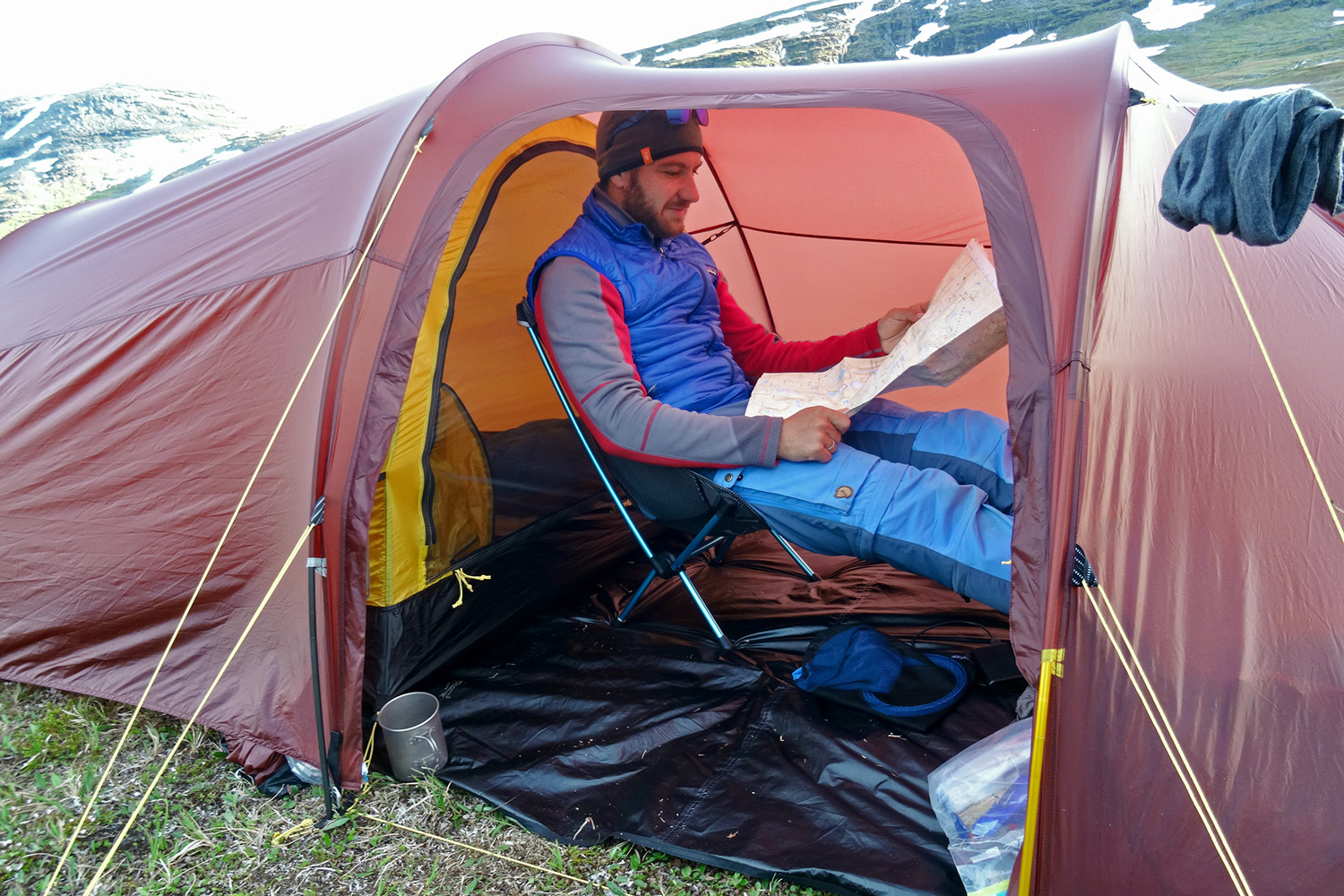 Selbst mit kompletter Ausrüstung kann man noch gut darin sitzen, sich umziehen oder gar darin kochen. Bei einer Innenhöhe von 110 Zentimetern konnte ich es mir in der Apsis sogar auf meinem Helinox Faltstuhl gemütlich machen und die Beine ausstrecken! Durch das helle Material des rötlichen Zeltes wirkt der Vorraum auch bei schlechtem Wetter hell und freundlich.