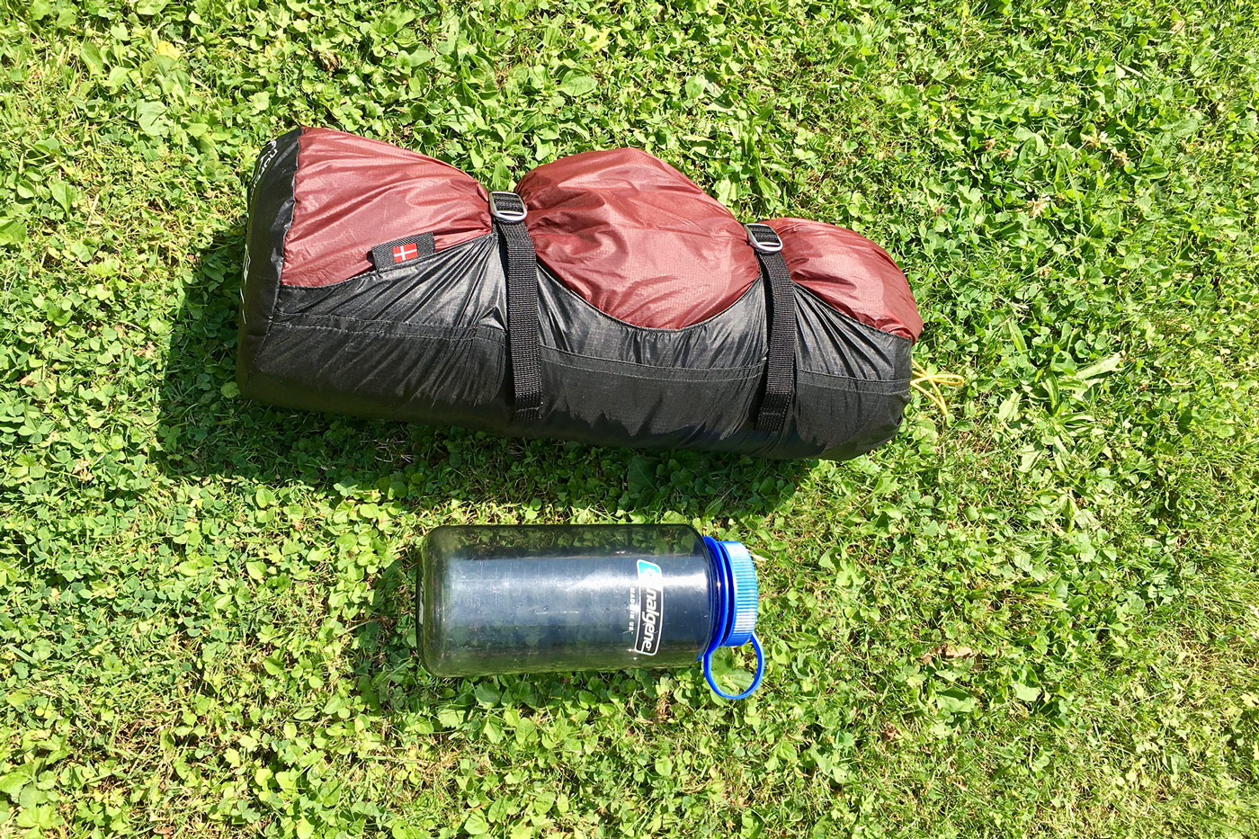 Trotz der sehr großen Abmessungen lässt sich das Oppland 2 LW erfreulich klein verpacken. Der mitgelieferte Packsack ist mit Kompressionsriemen ausgestattet und nimmt das Zelt samt Unterlage problemlos auf, ohne stopfen zu müssen. Sogar das Gestänge hätte noch mit hinein gepasst. Im Rucksack habe ich dies allerdings separat transportiert. Nordisk gibt ein Packmaß von 13 x 40 Zentimetern an. Bei mir war alles zusammen etwa so groß wie zwei Ein-Liter-Wasserflaschen und ließ sich problemlos mitsamt zwei weiteren Drybags im Bodenfach meines Deuter Aircontact Pro verstauen.