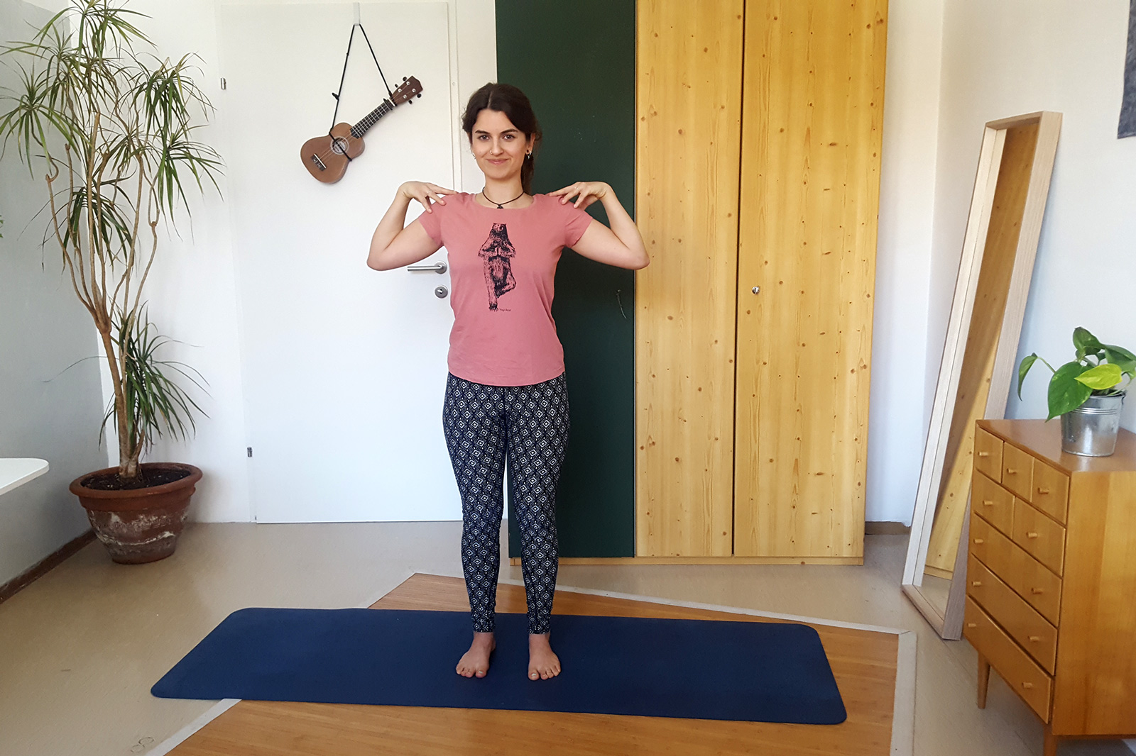 Stelle Dich aufrecht hin, die Füße sind hüftbreit aufgestellt. Mache den Rücken noch einmal ganz gerade und bewege die Schultern weg von den Ohren. Der Blick ist nach vorne gerichtet.
