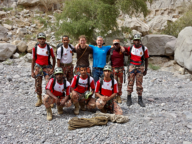 Vielleicht liegt es daran, dass der Großteil des Oman Steinwüste ist, es gibt jedoch zwei ausgesprochen großflächige Sandwüsten, die Wahiba Sands im Süd-Osten und eine unerforschte Wüste an der Grenze nach Saudi Arabien und Jemen. Für Liebhaber karger Landschaften und freundlicher Menschen genau das Richtige. Wir fliegen von München in dieses Land, das in so vielen Bildern in unseren Köpfen eine Vorstellung von 1001 Nacht zaubert, wie wir sie bis dahin nicht für möglich gehalten haben. Ausschlaggebend für unsere Reise waren unter anderem die Ambition, in einem Land zu klettern, in dem wir auch neue Routen erschließen können, und das an sich noch viel Potential bietet.