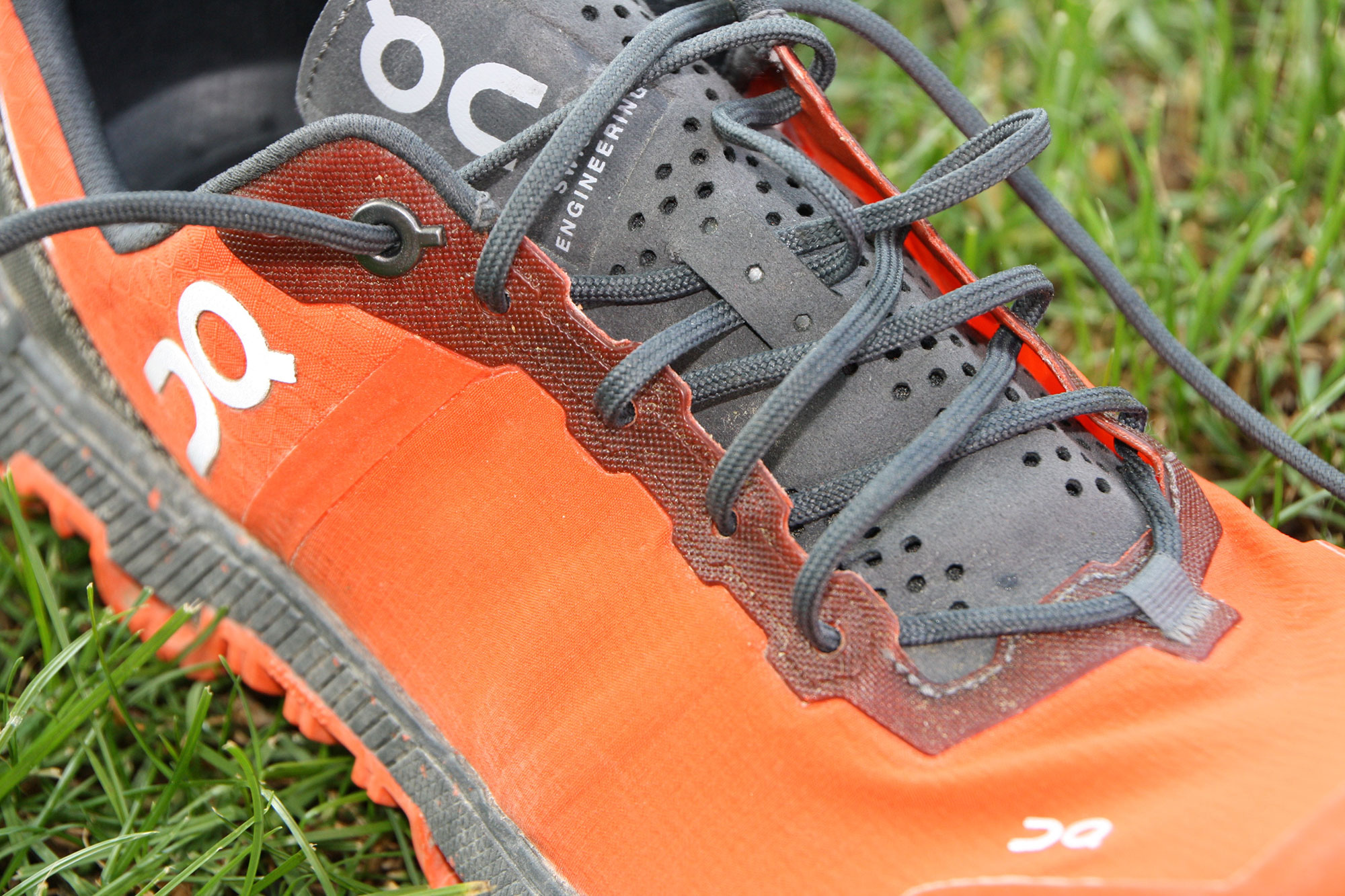 Der Cloudventure ist ein enganliegender Laufschuh, der mit einem dünnen Außenschuh und einem angenähten Innenschuh versehen ist. Vom Tragegefühl ist er nahezu mit einer Socke vergleichbar – durch die Stretch-Eigenschaften des Obermaterials passt sich der ON gut an die Fußform an. Die dünne Zunge ist am Innenschuh befestigt, wodurch ein Verrutschen beim Anziehen verhindert wird.