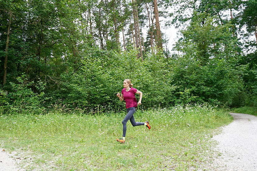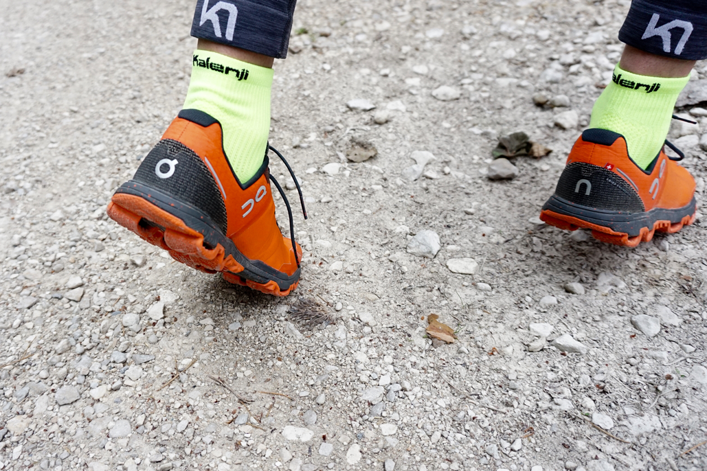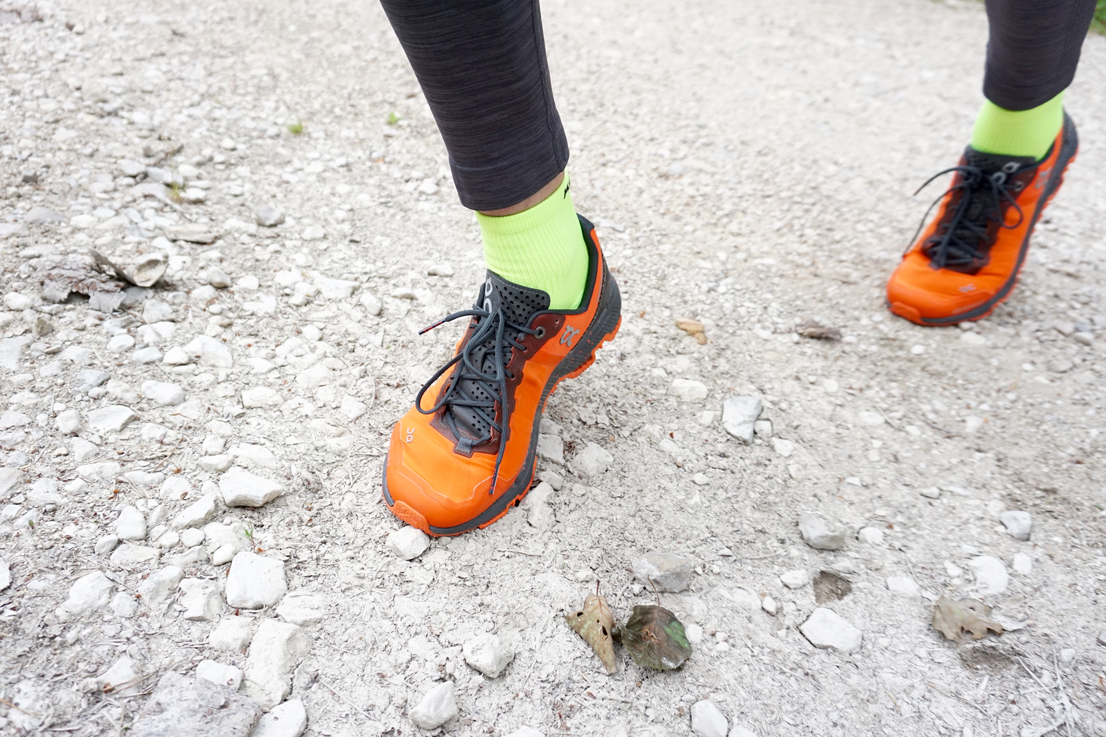 Also nichts wie raus aus den Hausschuhen (oder schweren Arbeitsschuhen) und rein in die ON! Es bedarf eines zweiten Blickes: Habe ich wirklich Schuhe an? Ja, habe ich! Mit nur ca. 200 Gramm ist der ON einer der leichtesten Trailrunningschuhe auf dem Markt. Schon bei den ersten Metern spüre ich einen deutlichen Unterschied zu meinen bisherigen Laufschuhen.