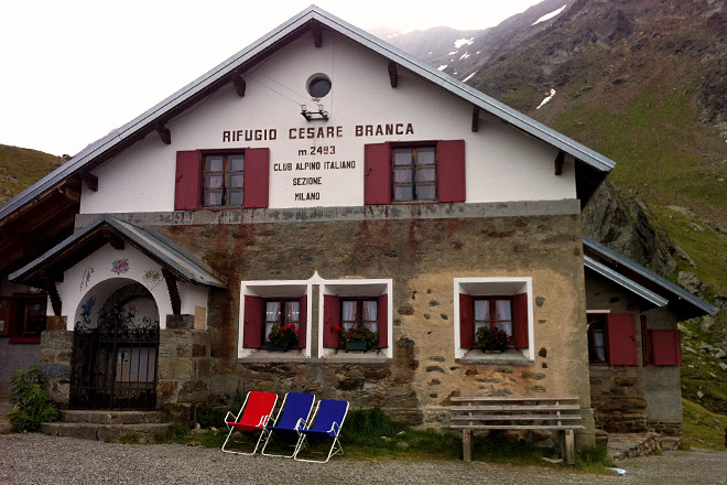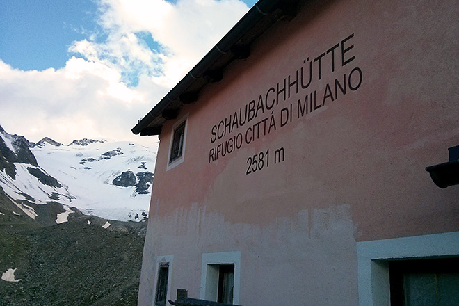 Dann sind es nur noch wenige Kilometer und Kehren, bevor man die Passhöhe und das Rifugio Bonetta erreicht. Nach einer heißen Minestrone machen wir uns über sehr lohnenswerte „Trail-Abkürzer“ an die Abfahrt ins Valfurva nach Santa Caterina. Und wie soll es auch anders sein: Es geht gleich wieder hinauf und zwar ins Val dei Forni. Denn als Übernachtungshütte haben wir uns auf dieser Etappe unserer Ortler-Umrundung das Rifugio Branca (2.487 Meter) direkt am Fuße der Ghiacciaio dei Forni (Forni-Gletscher) ausgesucht. Der Weg zu den Gletschern ist kein leichter, aber die fantastischen Ausblicke und die traumhaft gelegene Hütte entlohnen für alle Mühen! Oben angekommen machen wir es uns bei bestem Wetter und strahlendem Sonnenschein erst mal auf der Terrasse bequem und saugen den einmaligen Gletscherblick in uns auf. Das Abendessen ist derart lecker, dass wir gerne noch etwas hier oben bleiben würden.