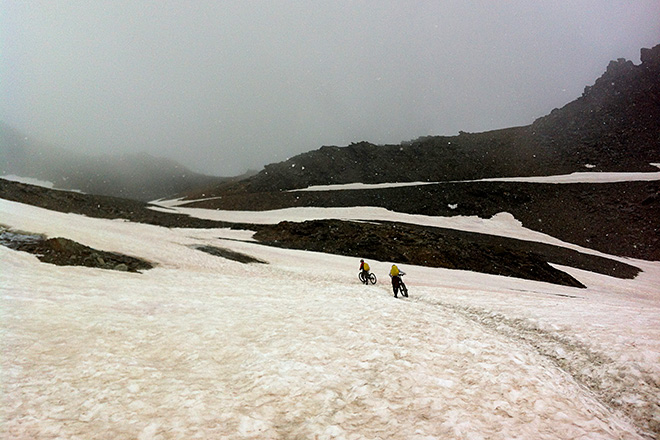 Tag zwei unserer Ortler-Umrundung per Mountainbike führt uns über einen der spektakulärsten Übergänge unserer Tour: das Madritschjoch (3.123 Meter). Auch im August führt der Weg hinauf durch Altschneefelder und ab 2.900 Meter fängt es dann auch an zu schneien. Nebel und Schnee tun dem Übertritt aber keinen Abbruch. Im Gegenteil: Sie tragen zur ganz besonderen Atmosphäre bei. Und der Trail vom Joch zur Zufallhütte entschädigt erst recht für alle Mühen des Bike-Wanderns. Denn am Madritschjoch wird auch der Biker irgendwann zum Wanderer. Der eine früher, der andere später… Am Zutriftsee vorbei fahren wir ab ins Martelltal und entdecken einen tollen Trail, der uns direkt oberhalb von Morter wieder ausspuckt, so dass wir ohne (Trail-)Unterbrechung in die Waalwege gen Latsch eintauchen können. Und es wird wärmer und wärmer und wärmer…
