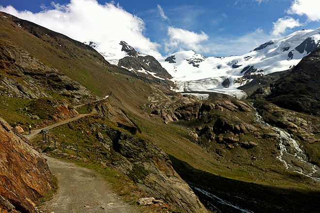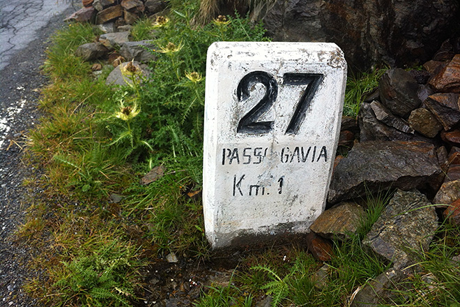 Der nächste Tag hat wieder Klassikercharakter: Der Passo Gavia (2.621 Meter) muss überwunden werden. Hier führt auch für Mountainbiker kein Weg an der Passstraße vorbei. Das ist aber auch nicht weiter dramatisch, denn die kleine schmale Passstraße ist wenig befahren und schlängelt sich mit schöner Aussicht und moderater Steigung gen Passhöhe. Die beiden Tunnel können auf einem Rest der alten Straße umfahren werden und hier hat man noch Gelegenheit, die Gedenkstätte für die einst verunglückten Alpini zu besichtigen.
