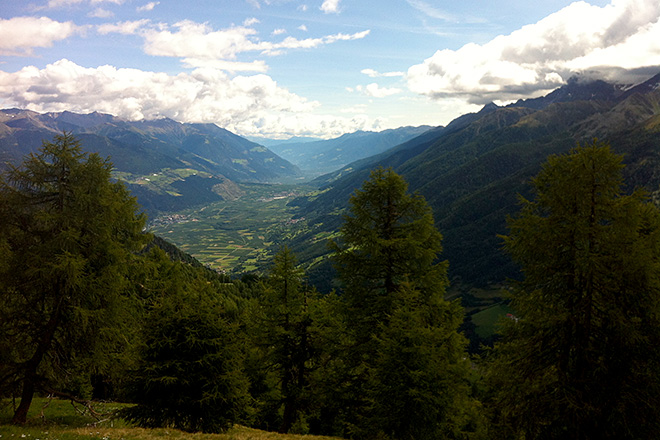 Das ist heute aber noch lange nicht alles. Denn schließlich müssen wir noch ins Ultental nach St. Walburg. Von Rabland aus fahren wir mit der Bahn nach Aschbach (1.362 Meter), kurbeln von dort wieder per Mountainbike hinauf zum Vigiljoch (1.743 Meter) und weiter auf schönen Trails vorbei an der Naturnser Alm (1.910 Meter) bis hinauf auf 2.200 Meter. Etwas unterschätzt haben wir den Weg Nr. 1 an den Falkomai-Almen vorbei, der uns ins Ultental bringt. Ein zweifelsohne schöner Hangweg, der stets zwischen 2.000 und 2.100 Metern am Hang entlang läuft und Kräfte sowie vor allem Zeit kostet. Als die Seilversicherung auftaucht, trauen wir unseren Augen nicht, aber da haben wir es auch schon fast geschafft. Noch einige Höhen- und Kilometer und das Ultental taucht unter uns auf – jetzt aber nichts wie hinab nach St. Walburg, denn es dämmert bereits.