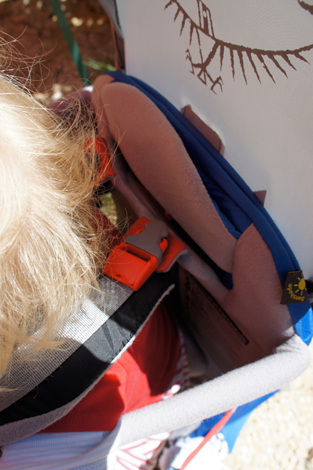 Als ich die Kraxe aufsetze, entdecke ich ein weiteres Detail, das mir an der Osprey Poco Premium gefällt: Beide Handgriffe sind gepolstert. Hier schneiden keine Schlaufen in die Hände ein und selbst jemand wie ich, der große Pranken hat, kann diese Griffe bequem nutzen. So lässt sich die Kindertrage samt Passagier angenehm und sicher hochheben. Dem Baby gefällt es dort oben, immerhin ist es rundum gut gepolstert. Ein kurzer Griff nach hinten und der Standfuß aus Aluminium ist eingeklappt. Bei sommerlichen Temperaturen steigen wir zwei auf. Immer wieder macht sich das Baby einen Spaß daraus, mir die Mütze vom Kopf zu ziehen.