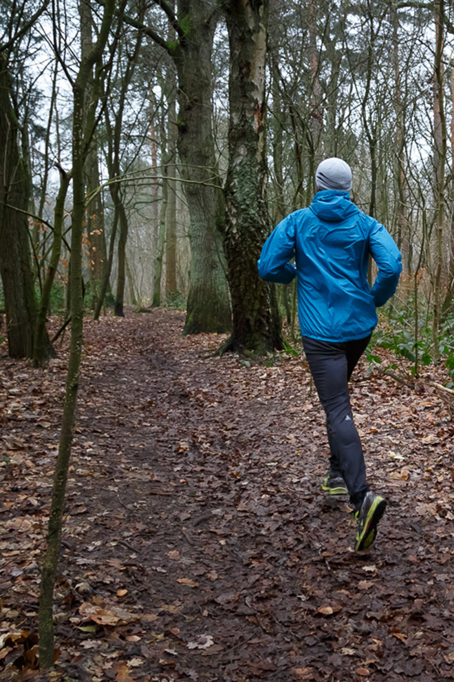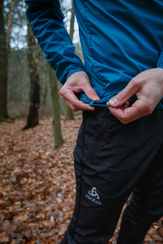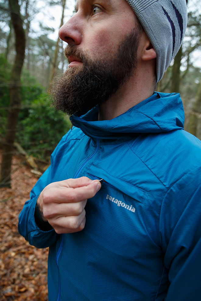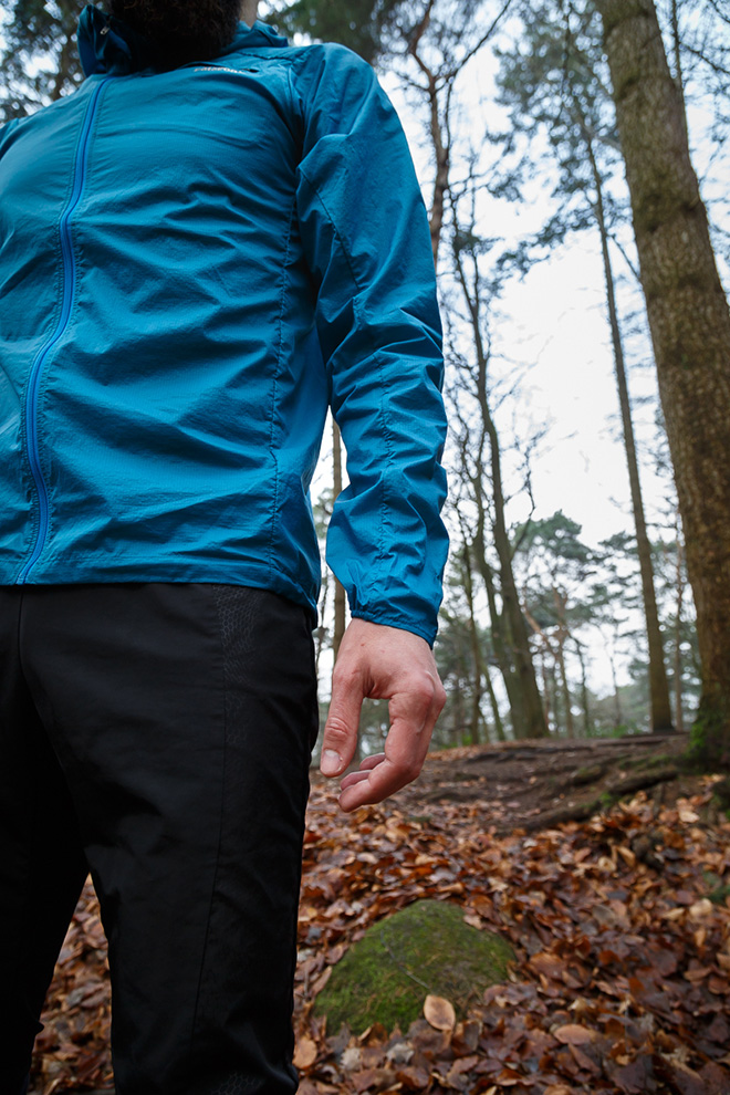 Natürlich bietet ein so konsequent auf Lightweight getrimmtes Kleidungsstück kaum Platz für zusätzliche Features. Sehr gut gefällt der ebenfalls DWR-imprägnierte, leichtlaufende Front-Reisverschluss mit Kinnabdeckung. Taschen? Exakt eine auf der linken Brust. Diese bietet Platz für maximal ein bis zwei Riegel oder Gels oder einen kleinen MP3-Player, während gängige Smartphones den Rahmen sprengen. Als Packesel ist das Teil aber auch nicht gedacht. Mir persönlich ist der Reißverschluss der Tasche etwas zu klein geraten und lässt sich beim Laufen meist nur mit beiden Händen bedienen. Sehr praktisch: Die Tasche dient zugleich als Beutel, in den sich die Jacke „hineinkrempeln“ und der sich über eine Schlaufe am Rucksack oder Gürtel befestigen lässt.