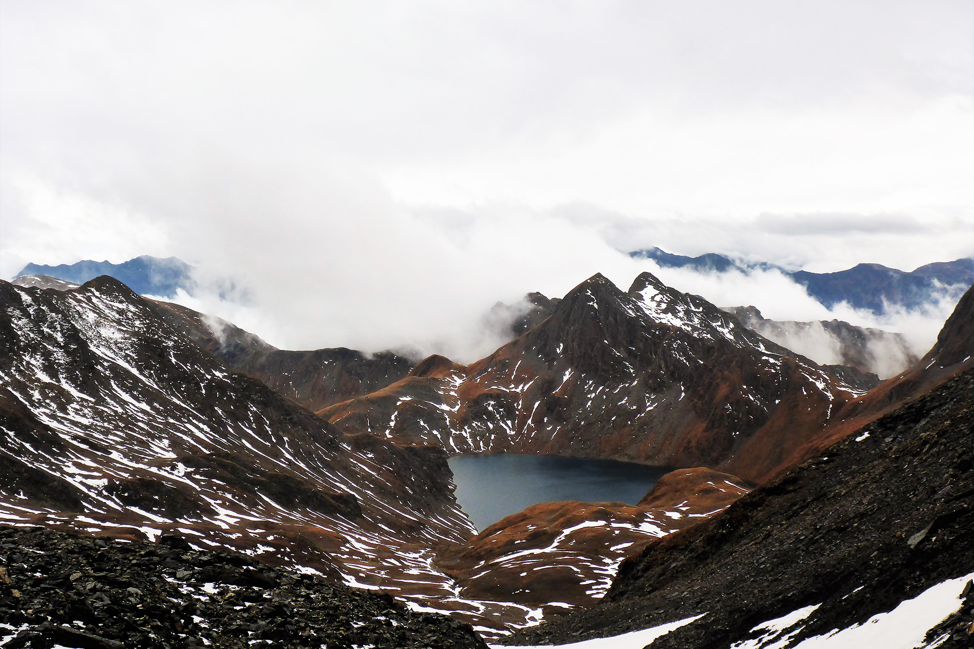 Das letzte Stück zur Scharte ist kaum zu sehen und führt steil auf der linken Seite des Übergangs entlang. Doch auch hinab erweist sich der Weg als schwieriger, als zunächst vermutet, denn er ist rutschig und locker. Schutt, Sand und Kies liegen auf dem ausgetretenen, abschüssigen Pfad. Das poröse Gestein lässt laut Hüttenwirt keine Seilsicherung zu, weswegen nur das Vertrauen auf die eigenen Trekkingstöcke bleibt. Die letzten Meter bis zur Tiefrastenhütte (2.312 m), gelegen an einem schönen See, werden wir von leichten Schneeflocken begleitet.