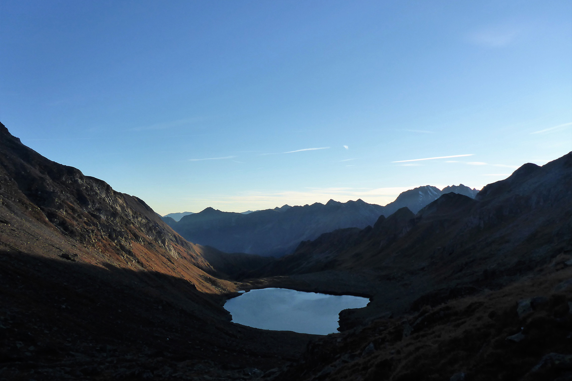 Nach dem Überqueren des vorerst letzten kleinen Flusses eröffnet sich rechts ein weiterer Ausblick auf das bereits bekannte Pustertal. Ein anstrengender Teil führt uns über vom Herbstwetter rutschige Steinfelder und Grashänge zur Scharte. Danach geht es abwärts in Richtung Engbergalm-Kessel und weiter entlang schmaler Wegstücke, bis wir einen kleinen See erkennen können. Da es bereits später Nachmittag ist, beschließen wir, dort unser Zelt aufzuschlagen. Ein großer Felsblock und eine hüfthohe Steinmauer bieten uns Schutz vor dem Wind.