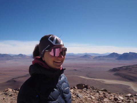 Bergzeit Testerin Melanie ist 1,60 Meter groß und trägt die Punta Berrino Skitourenkombi in Größe XS.
