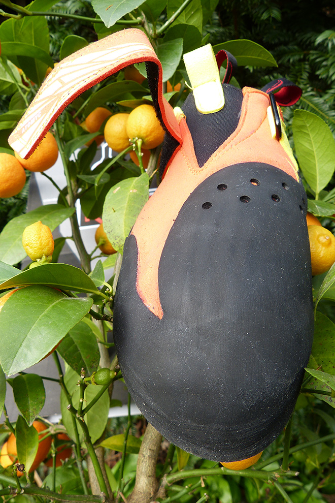 Im Zehenbereich ist der Gummi asymmetrisch weit nach hinten gezogen – ohne störende Überlappungen oder Nähte (was sehr zum Tragekomfort beiträgt). Der Klettverschluss drückt dabei die Zehen fest in die Schuhspitze mit ihrem ausgeprägten, ergonomischen Downturn. Dies ermöglicht eine optimale Kraftübertragung auf den Tritt. Die Größe der Toebox ist für meine breiten Füße grenzwertig, für schmalere Füße jedoch sehr gut geeignet.