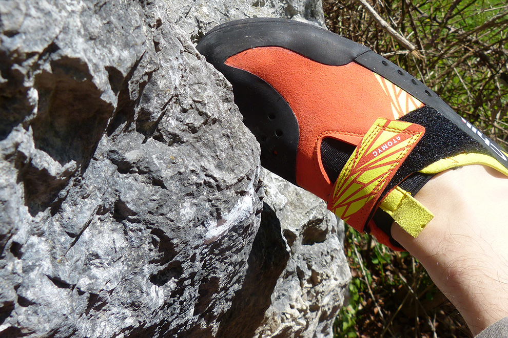 Im Gegensatz zum Octan ist die Form des Atomyc nur leicht asymmetrisch, der Downturn jedoch nicht so aggressiv. So kann man auch auf Reibung noch perfekt stehen (Volumes in der Halle, Platten und abschüssige Tritte am Fels). Die Vorspannung empfinde ich nicht so extrem wie bei anderen High-End-Modellen, zum Beispiel von La Sportiva oder Five Ten. Eine Besonderheit ist der zweigeteilte Sohlenaufbau und die weiche Zwischensohle, die den Kletterschlappen sehr flexibel und feinfühlig in technischen Routen macht.
