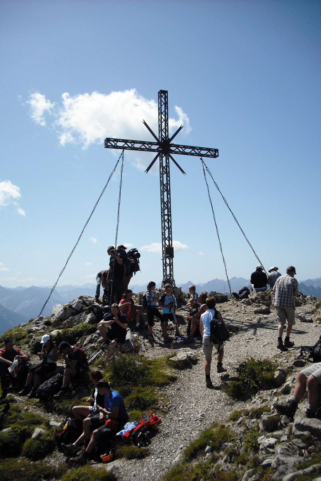 Aber natürlich setzen wir unseren Weg fort, gehen dazu hinter die Hütte und steigen den oberen der Steige schräg bergan, bis wir in eine große Mulde kommen. Rechts über uns türmt sich der Gimpel auf, wir biegen links ab und weiter geht es über Geröll bis zur Judenscharte. Die nun folgenden Felsstufen sind drahtseilversichert und ohne große Schwierigkeiten nehmen wir die letzten Meter bis zum Gipfelkreuz (2111 Meter) unter die Sohlen. Geschafft!