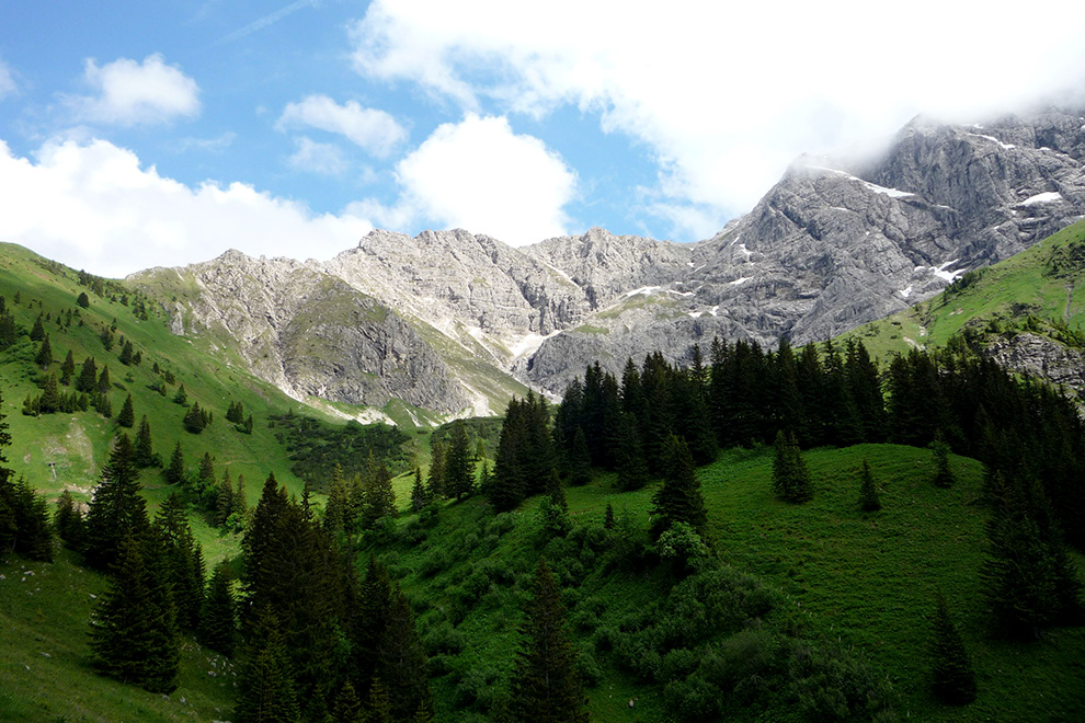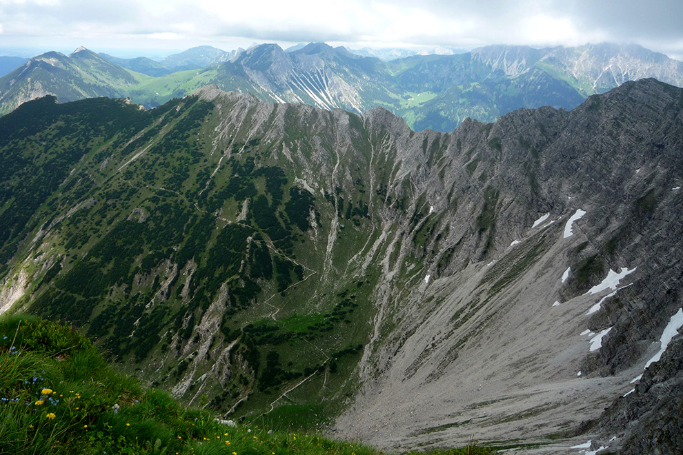 Von Hinterstein geht es zunächst durch einen schönen Wald und schließlich über Alpböden bis zur Oberen Älpele-Alpe, die malerisch auf freiem Gelände steht. Bald erreichen wir über einen Bergrücken schon Fels, steigen auf einem alpinen Steig bis zum Grat und erreichen den Gipfel des Breitenbergs. Bereits hier könnte man über das Häbelesgund wieder absteigen. Wir freuen uns jedoch auf die wunderschöne, ausgesetzte Gratüberschreitung über die „Hohen Gänge“, die über die Heubatspitze zum Nachbargipfel, der Rotspitze, führt.