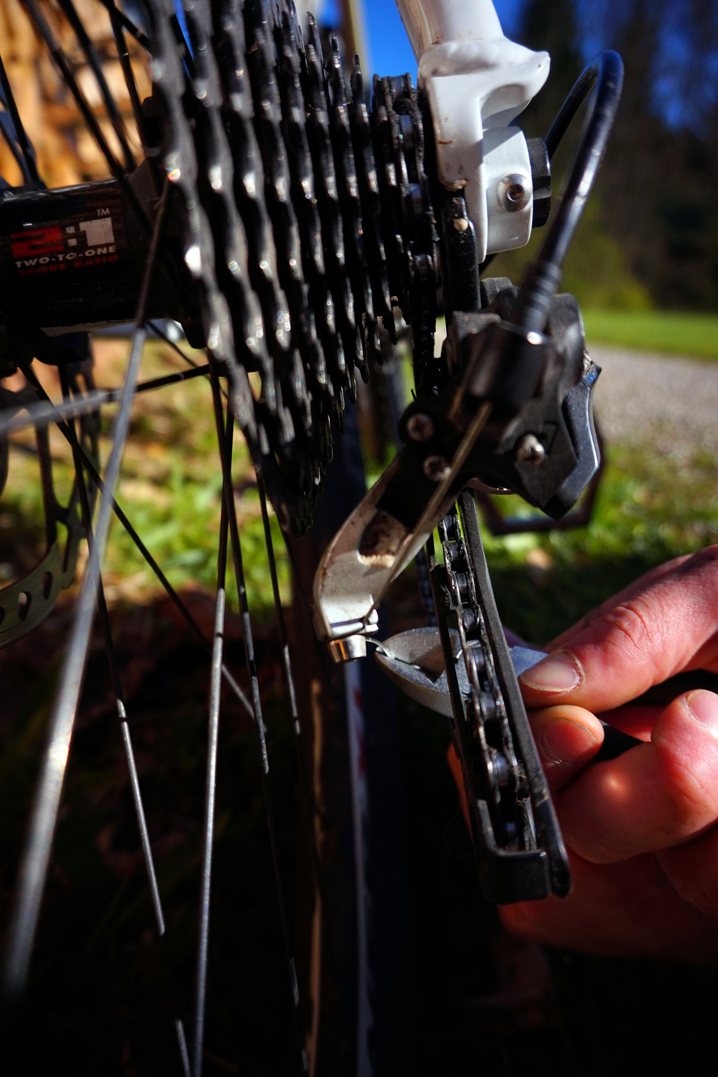 Ist das Schaltseil gerissen und kein Ersatz in Sicht, gibt es eine Notlösung. Um Umwerfer bzw. Schaltwerk in einem möglichst „neutralen“ Gang zu fixieren, mit dem man noch einigermaßen vorwärts kommt, wickelt man aus dem Schaltseil eine Schlaufe und versucht, diese an einer geeigneten Stelle am Rad zu fixieren. Dafür eignen sich beispielsweise Anlötsockel am Rahmen oder auch der Flaschenhalter.