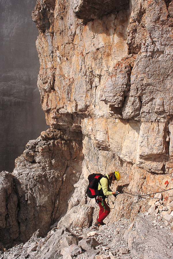 Schmale Gesimse ebnen den Weg durch eine Felslandschaft voller Dramatik und Urgewalt. Stets lauert nur einen Fußbreit neben uns die bodenlose Tiefe! Ohne die aufwendigen Sicherungen käme man hier wohl nicht sehr weit. Die klettertechnischen Anforderungen bleiben allerdings in einem genussvollen Rahmen, sodass man das außergewöhnliche Landschaftsambiente voll in sich aufsaugen kann. Allenfalls bei Vereisung kann es ziemlich kritisch werden, und wenn sich der berüchtigte Brentanebel im Felsengewirr verfängt, steigt vielleicht auch ein wenig Beklemmung in uns hoch.