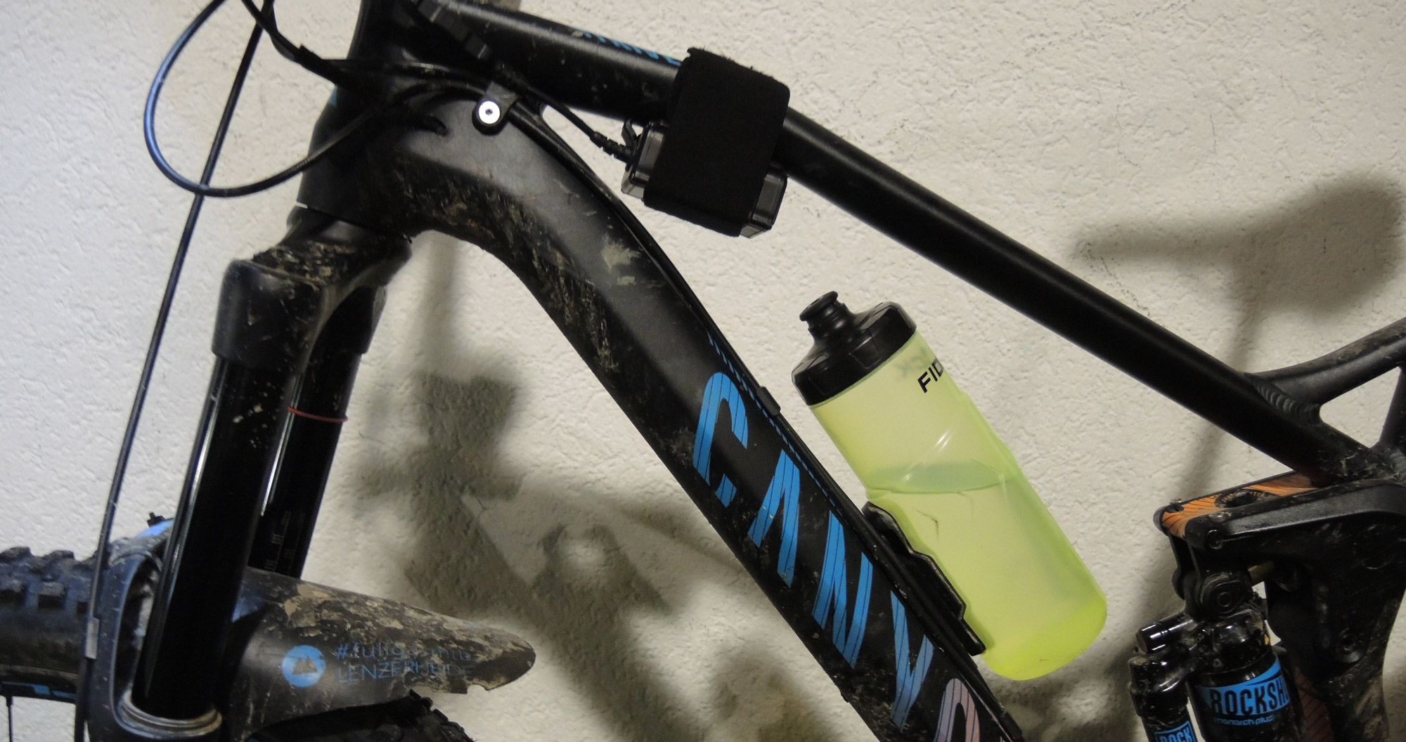 Um mit dem Rad starten zu können, muss ich zunächst den Gummistrap mit der Lampenhalterung am Lenker fixieren und anschließend den Akku sinnvoll anbringen. Hierfür war das am Akku angebrachte Stretch-Textilband perfekt, da der Akku somit nicht nur am Stirnband, sondern auch am Rahmen des Fahrrads fixiert werden konnte. Zum Praxistest bin ich dann mit dieser Konstruktion auf meinen Lieblingstrail unterhalb des Blomberghauses gefahren.