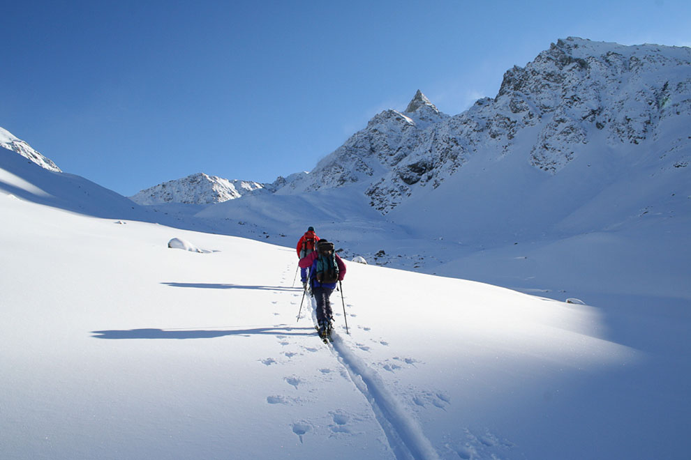Achtung: Die hier vorgestellten Touren sind nicht die Standardtouren. Sie beinhalten (Abfahrts-) Varianten, welche aufgrund der Lawinenverhältnisse nicht immer durchführbar sind. Alternativ bzw. im Zweifel entlang dem Aufstieg über die Normalrouten zurück ins Tal.