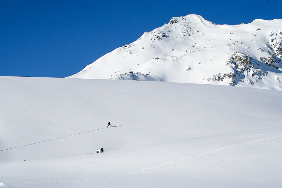 Während im Sommer der Albula-Pass nicht zur Ruhe kommt, hält er zur kalten Jahreszeit seinen Winterschlaf. Ein vergleichsweise hohes Verkehrsaufkommen gibt es fast nur hinauf zur Crasta Mora, welche sich aber durch den kühlen Albulawind oft von ihrer abweisenden Seite zeigt. Doch spätestens am Gipfel stechen die Hänge des Piz Blaisun ins Auge. Hier scheint es so, als ob Frau Holle ihre Betten über den Gipfel gespannt hätte. Weite, freie Hänge. Allerdings auch steile Hänge. Ebenso wie am benachbarten Piz Kesch lässt sich eine feine Überschreitung einbauen.