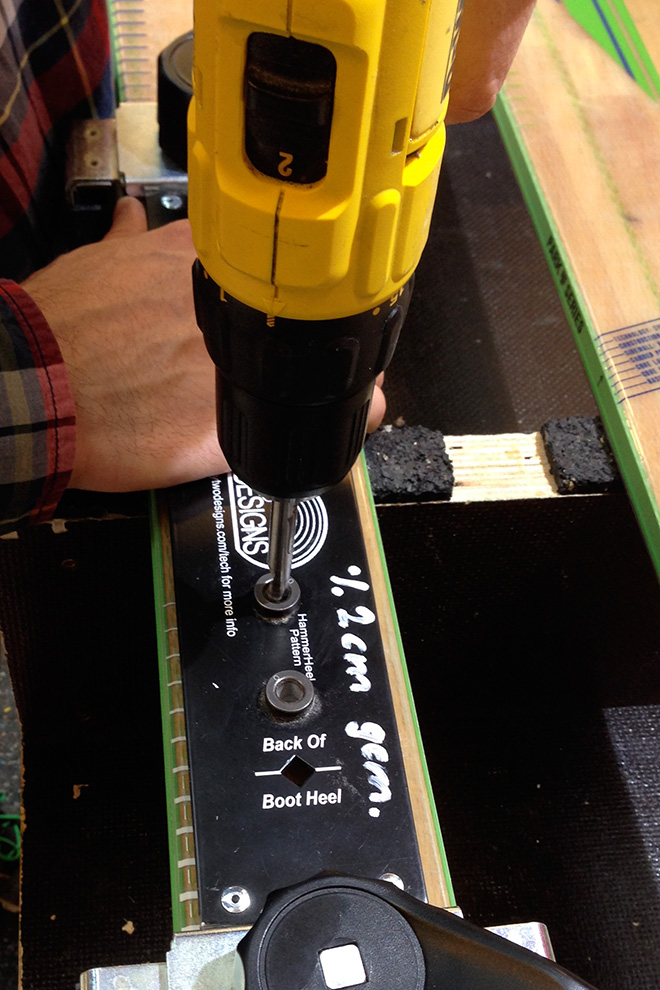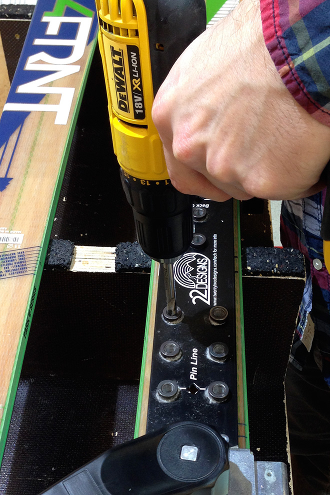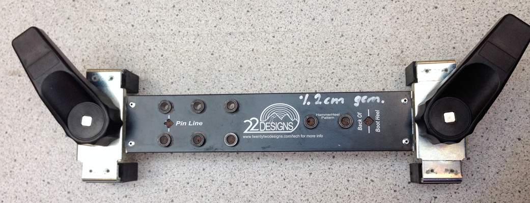 Im vorliegenden Beispiel wurde eine 22Designs-Telemarkbindung mit Hilfe einer 22Designs-Bohrlehre montiert.