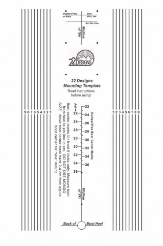 Kaum jemand wird zu Hause eine originale Bohrlehre des Bindungsherstellers besitzen. Es gibt jedoch die Möglichkeit, eine Papierschablone vom Hersteller zu bekommen. Im Internet wird zu fast allen Bindungstypen eine Schablone zum Ausdrucken angeboten (Wichtig: ohne Vergrößerung/Verkleinerung ausdrucken). Bild 7 zeigt eine Papierschablone vom Hersteller 22Designs (AXL, Vice & Outlaw). Hier befinden sich alle benötigten Angaben zur Montage. - Montagekleber