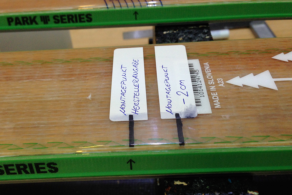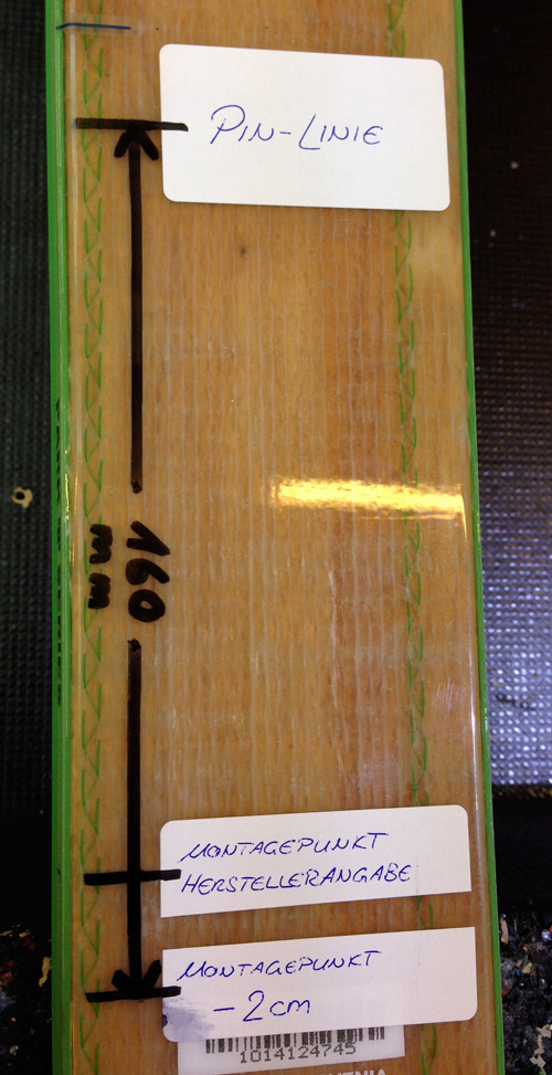 - Montagepunkt auf dem Ski festlegen (hier: zwei Zentimeter nach hinten versetzt).