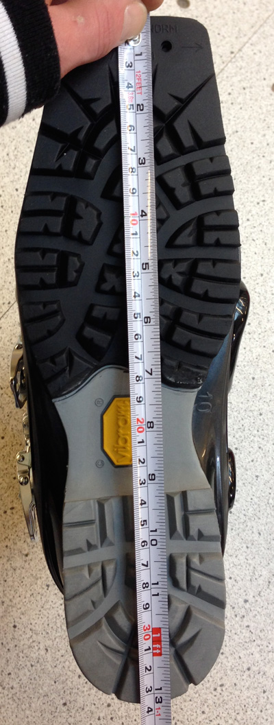 Ermittlung der Sohlenlänge des Telemarkschuhs.