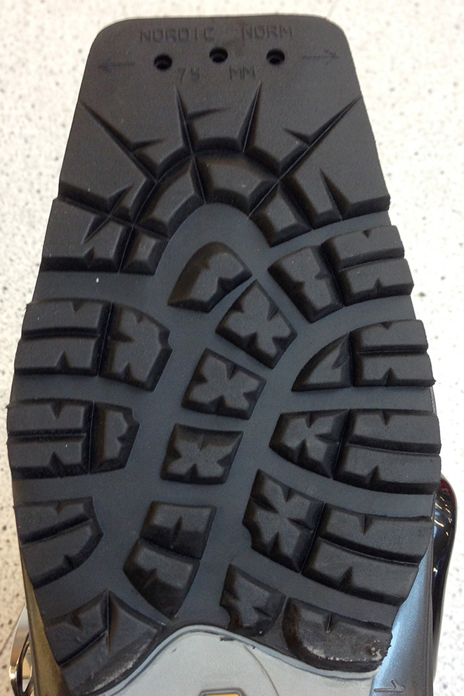Die Pin-Linie liegt bei einem Schnabelschuh exakt 15 Millimeter hinter der Schuhspitze (Schnabelspitze). Zu Zeiten der 3-Pin-Bindungen waren in der Schuhsohle drei Löcher eingearbeitet, um den Schuh auch in der Bindung fixieren zu können (Bild 4). Bei den neuen 75-Millimeter-Schuhen sind diese Löcher meist nicht mehr vorhanden. Diese Angabe wird in der Regel benötigt, da viele Bohrschablonen sich auf die Pin-Linie und das Fersenende des Schuhs beziehen. - Fußmitte/Schuhmitte