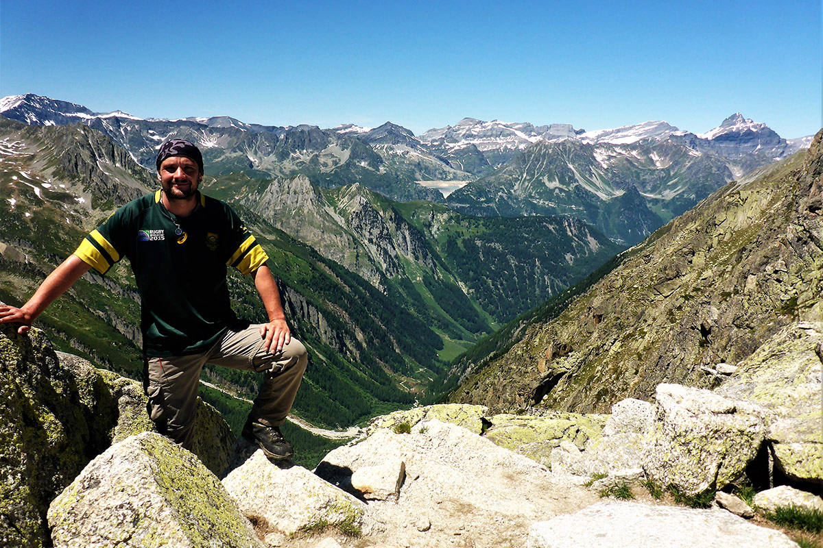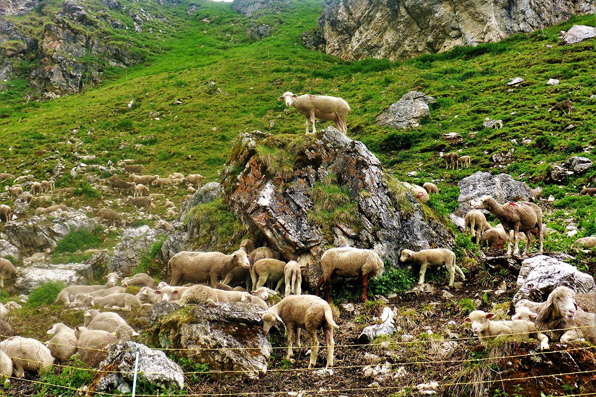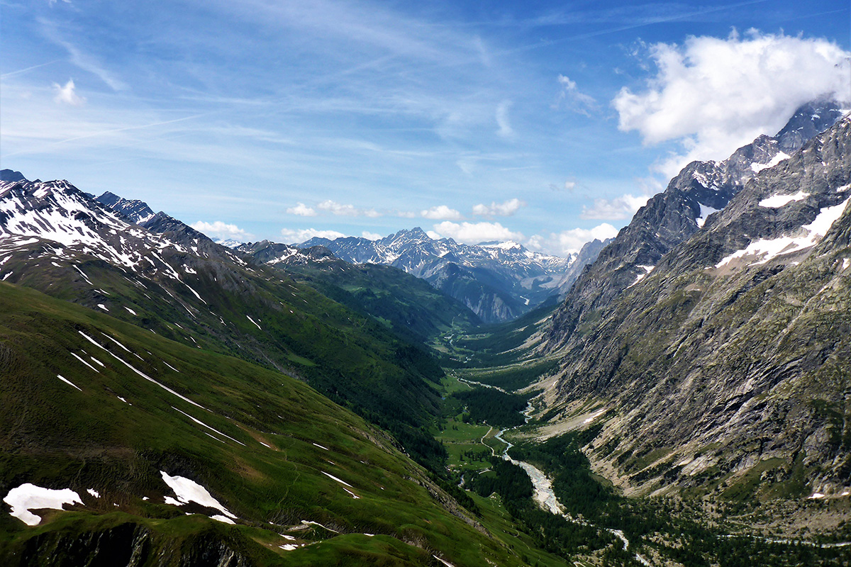 Am nächsten Morgen erreiche ich eine Stunde nach Aufbruch das Rifugio Elena (2061 m), mit nassen Füßen. Es ist „erst“ Mitte Juni, noch sind nicht alle Brücken für den Sommer installiert. Die Hütte hat ebenfalls noch nicht geöffnet. Der letzte Anstieg im Land von Pizza und Pasta folgt Serpentinen, von 2061 hinauf auf 2537 Meter zum Grand Col Ferret. Eine Herde Steinböcke vergnügt sich wenige Kilometer entfernt zu meiner Rechten.