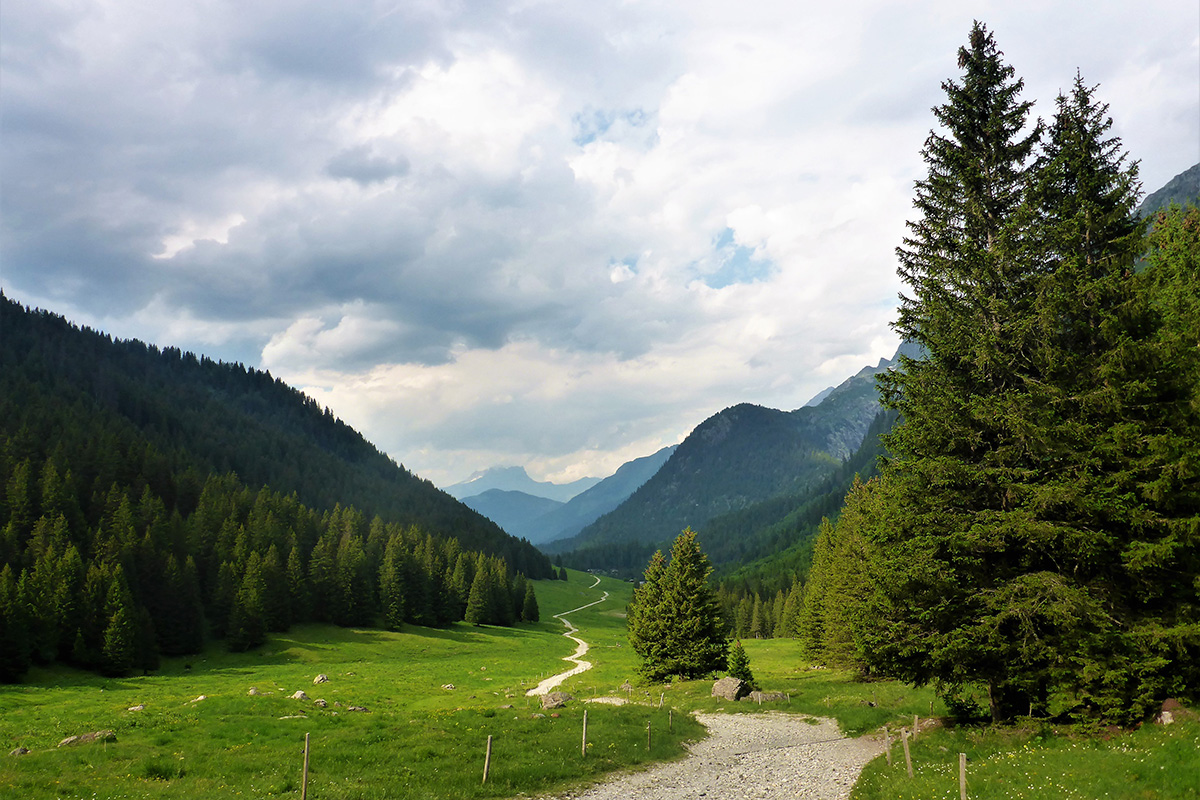 Nach dem „großen Pass“ betrete ich die Schweiz. Über grüne Wiesen und Schneefelder führt der Abstieg zu La Peule, einem zum Refugio umfunktionierten Bauernhof. Zwei weitere Stunden später, durch Margeritenwiesen und entlang des Flusses Drance de Ferret, erreiche ich La Fouly. Das Dorf hat 80 ständige Einwohner, 100 Chalets, 20 Wohnungen und ein paar Hotels – der Fokus ist leicht zu erraten.