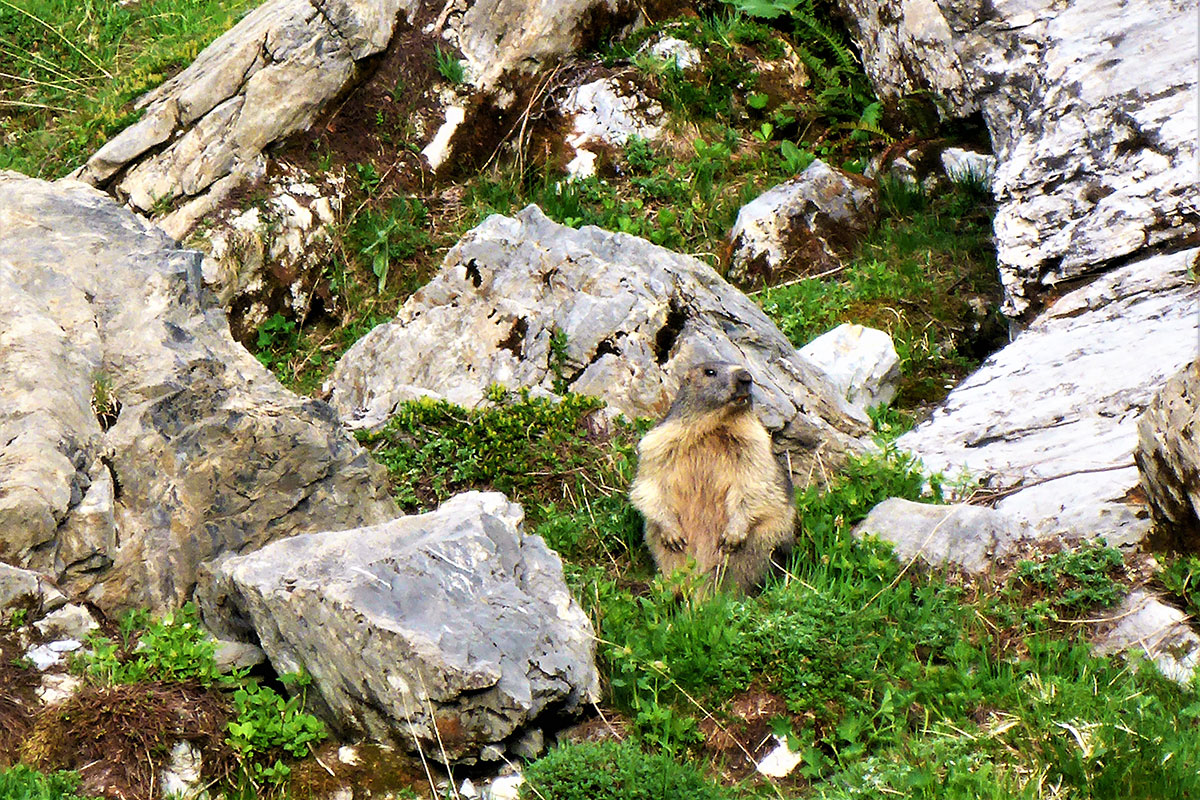 Von dort folge ich dem ebenen Weg zwei Stunden, bis das das Refuge des Mottets in Sicht kommt, schön gelegen am Ende des Tals. Beim Aufstieg zum Col de la Seigne (2516 Meter) kann ich mehrere Murmeltiere beim Sammeln von Heu beobachten. Nachvollziehbar – wer möchte schon auf ein weiches und warmes Nest verzichten?